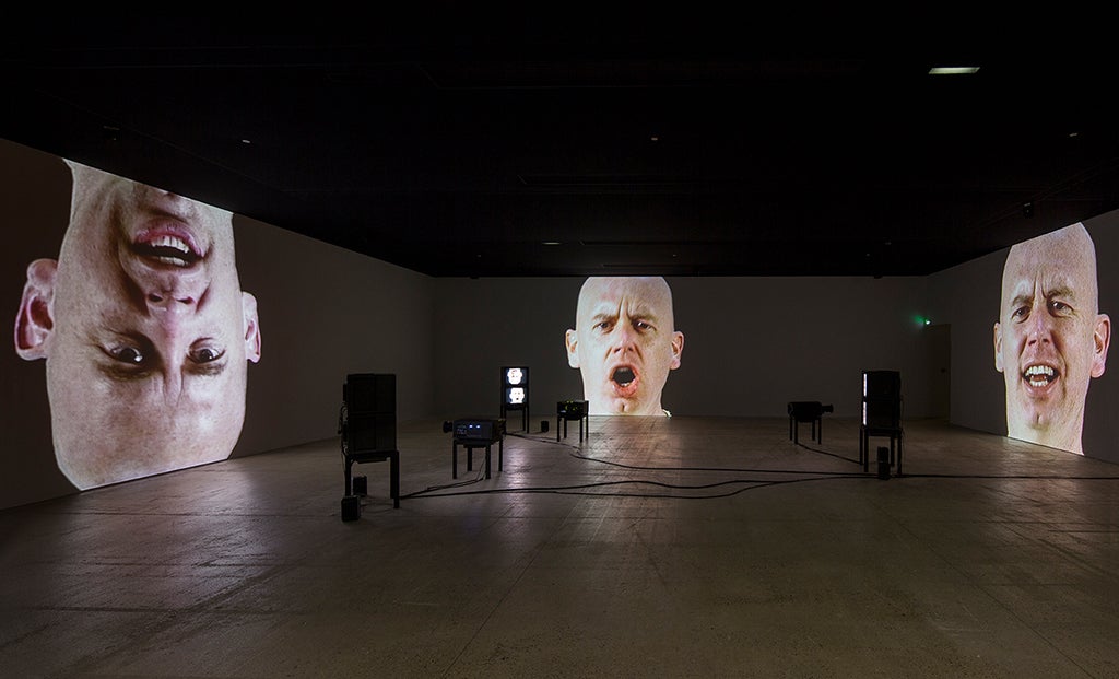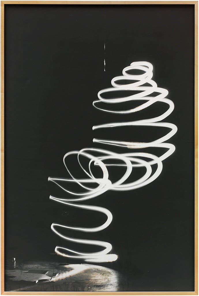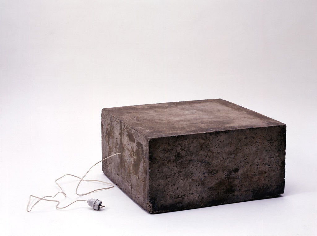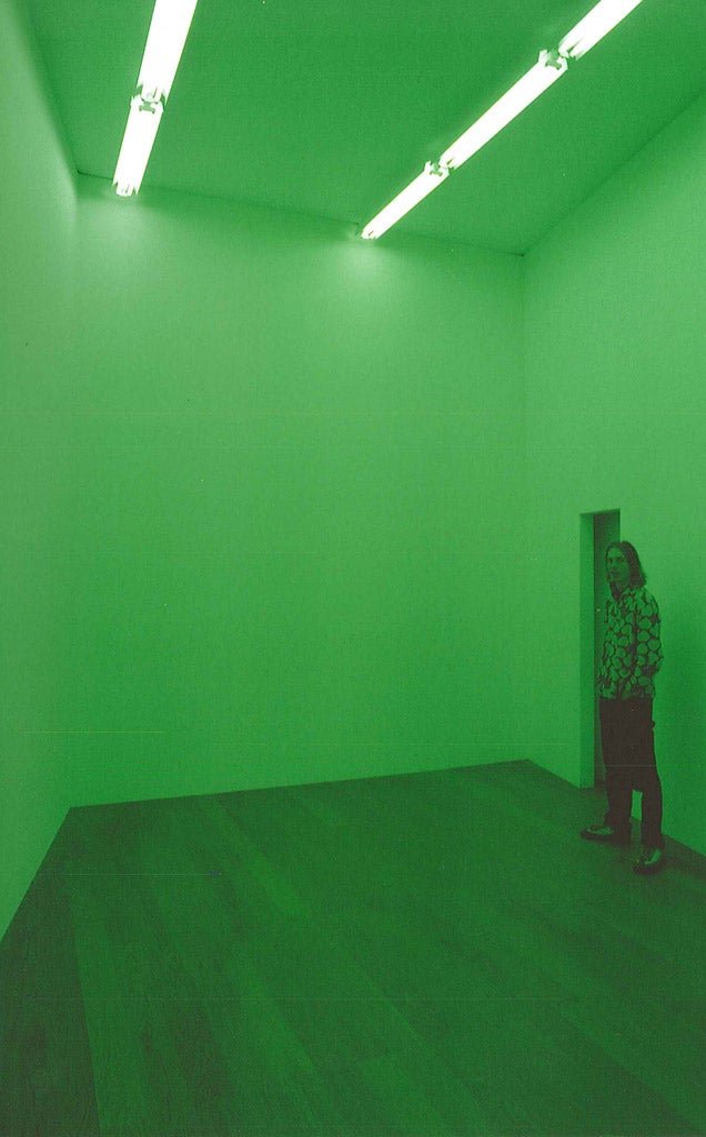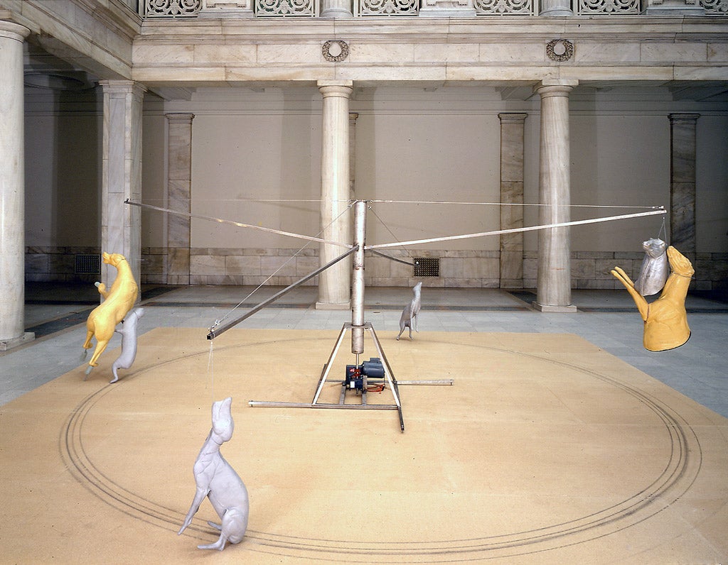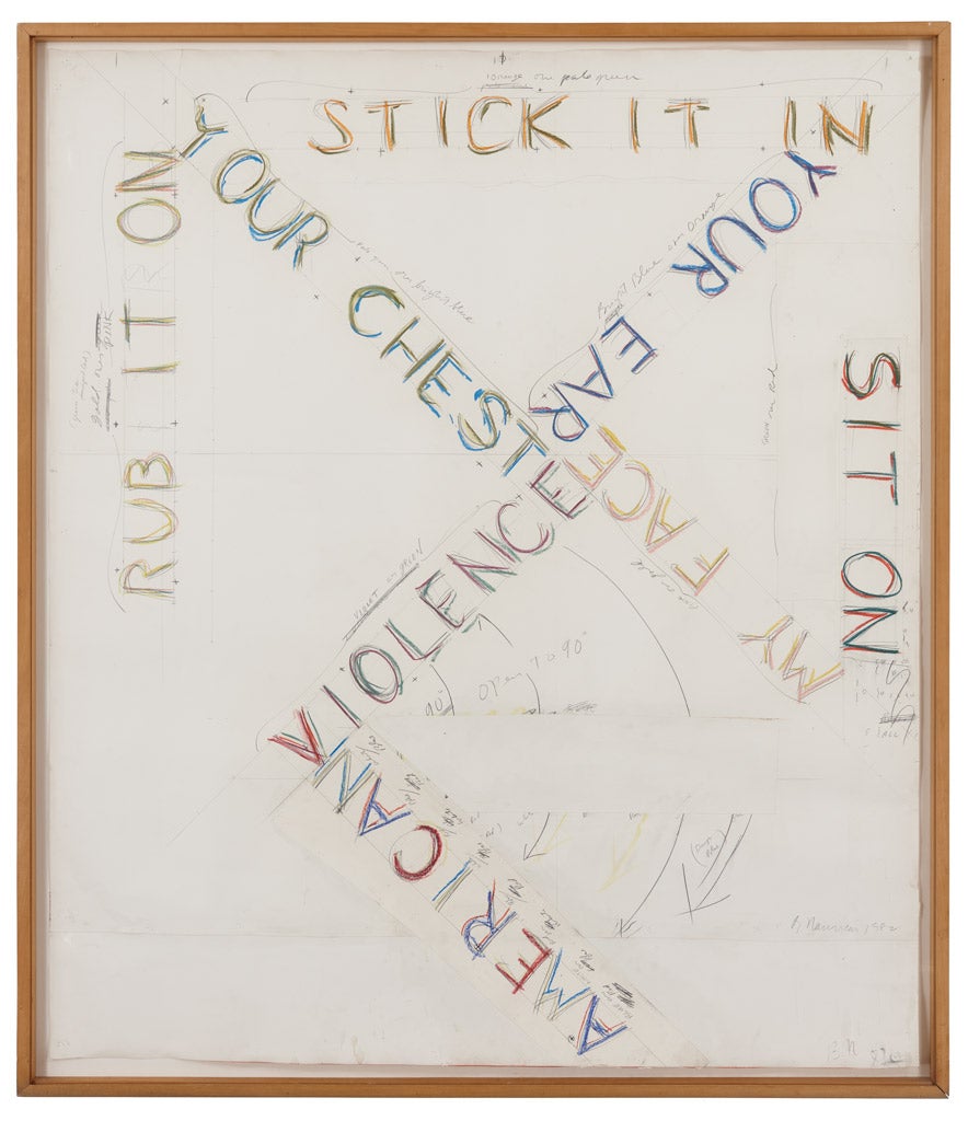 Works by American artist Bruce Nauman span a diverse range of media, from photography and drawing to video and neon. American Violence, 1981–1982, in Glenstone’s collection, consists of eight words or phrases rendered in neon in the shape of a swastika. All components of the light fixtures are intentionally visible to the viewer: the power station with its Plexiglas cover, the transformer, and four short power cables. The voltage applied to the neon glass tubes causes different mixtures of gas to emit light in various colors. As American Violence flashes on and off we see phrases both ominous and absurd, as though illuminated on the Las Vegas strip. The works remains unsettlingly relevant more than 40 years after it was made.