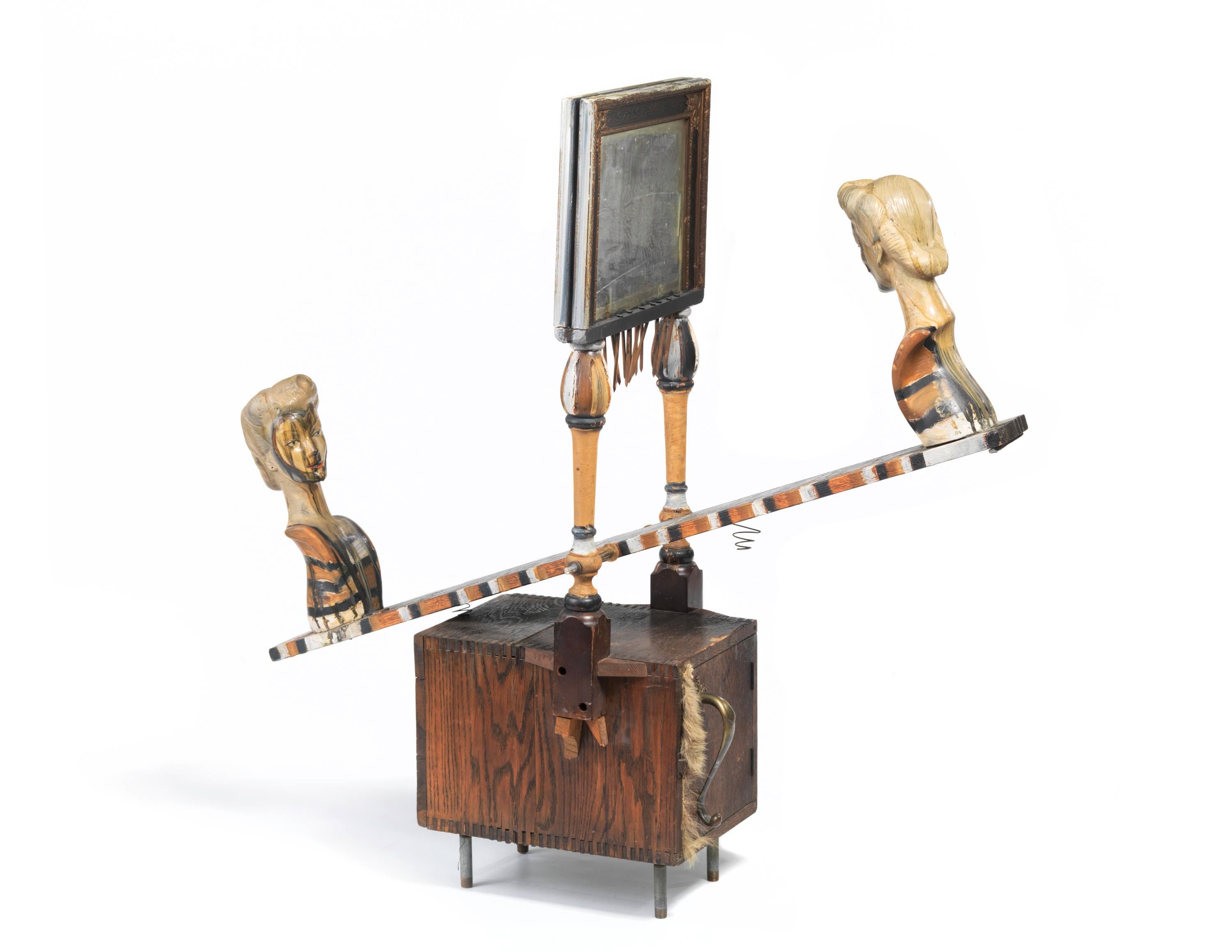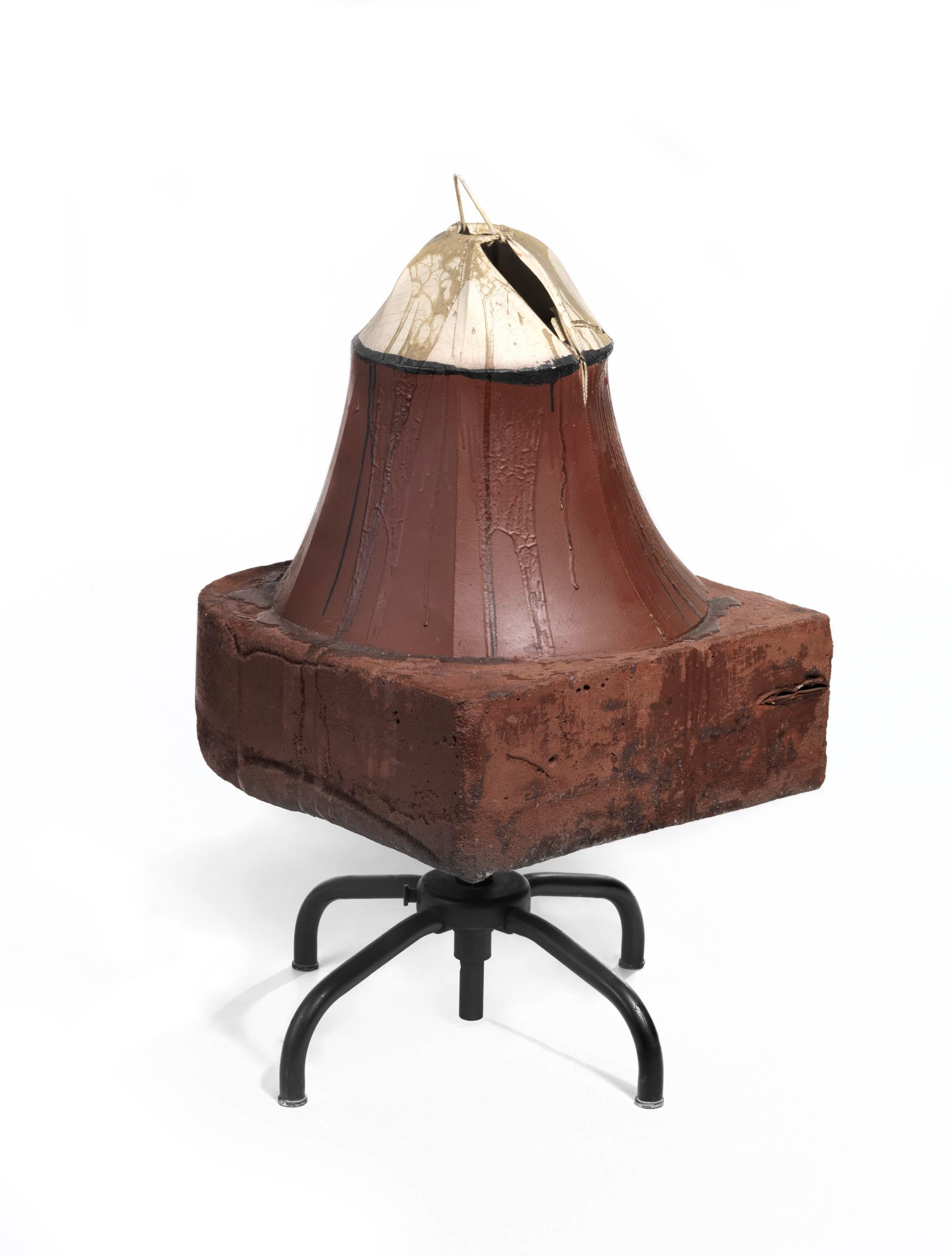 Ed Kienholz, a self-taught sculptor who frequently sourced material in flea markets and junk shops, made large-scale multimedia installations often centered around hypocrisy and contemporary life. For most of his career, Kienholz worked in collaboration with his partner, Nancy Reddin Kienholz. The Eleventh Hour Final, 1968, in Glenstone’s collection, exemplifies the surreal sculptures and environments for which Kienholz became known. The artwork is a living room scene; the title refers to the focal point of the installation, a television set broadcasting the 11:00pm news. The television is frozen on a screen familiar at the time—a tally of the wounded and dead in the Vietnam War—with a severed wax head within the TV staring back at the viewer.