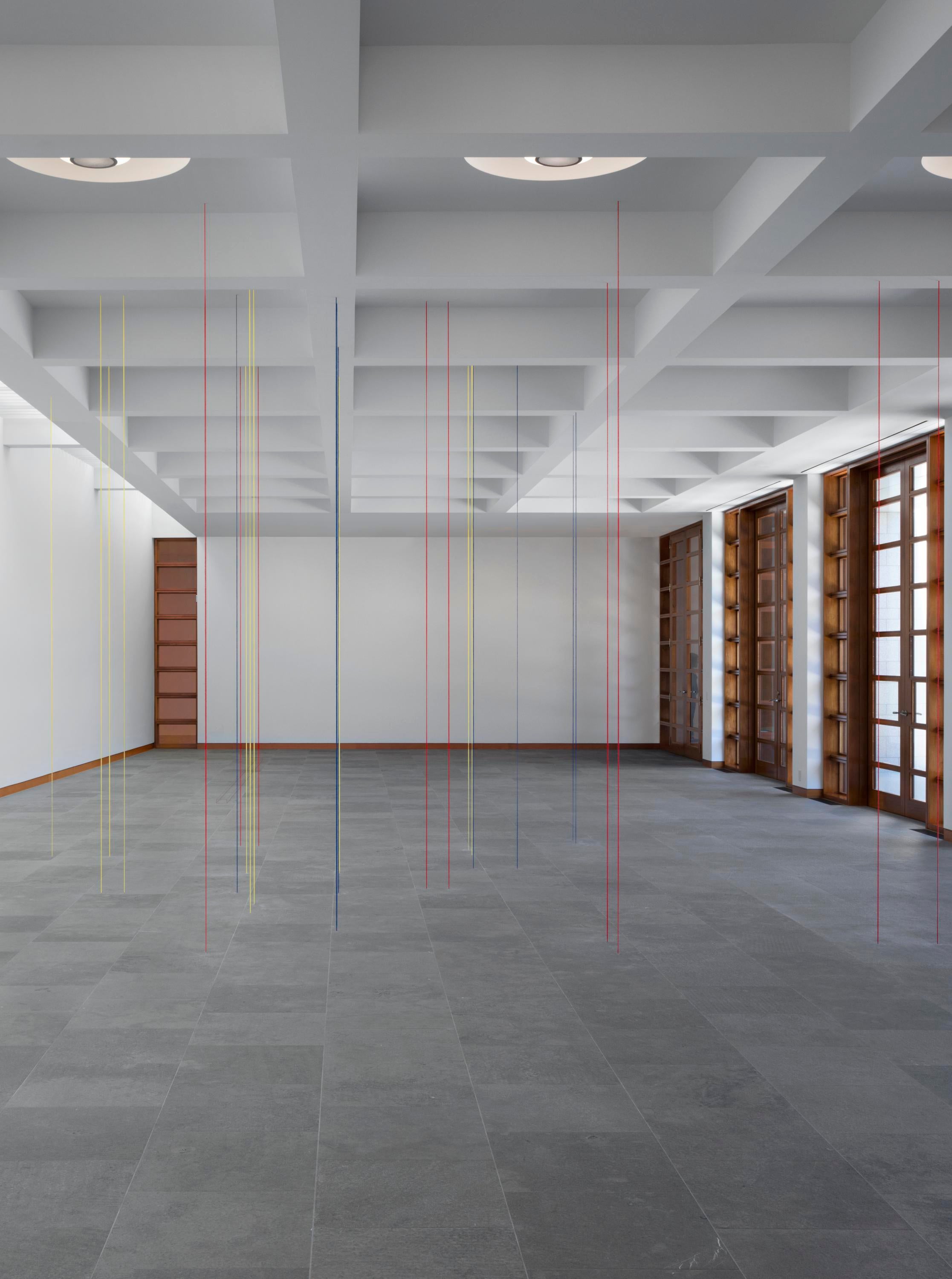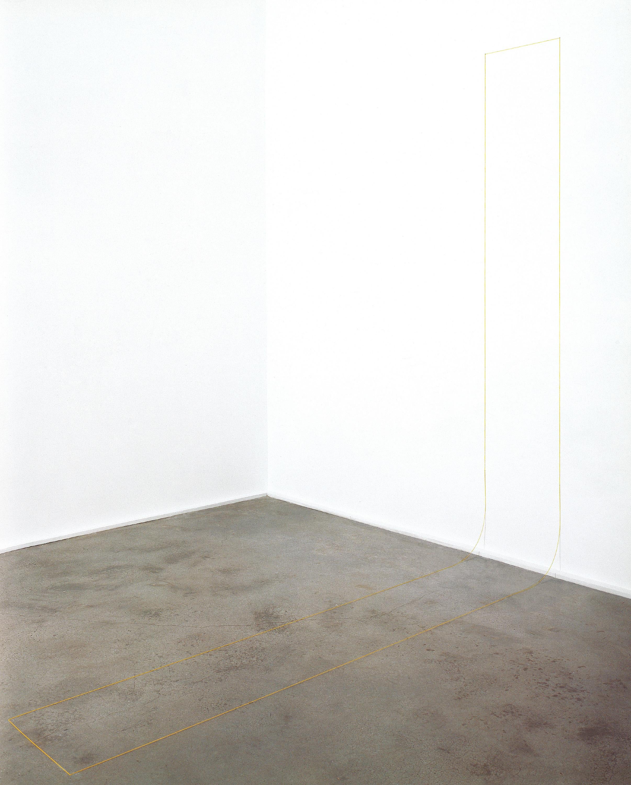 Often referred to as “drawings in space,” American sculptor Fred Sandback’s artworks engage their architectural surroundings using the barest of means: cord, thin metal rods, and string. His creations, while seemingly delicate, have an immersive, visceral effect. One does not look at them; one shares space with them. To fully engage is to walk around or through the spaces they inhabit. Untitled, 1968/1983, in Glenstone’s collection, stands as an early example of Sandback’s striking, elegant simplicity—and the way these simple gestures served to radically upend traditional notions of art. In this work the artist used thin metal rods to outline a row of four invisible “boxes” at an angle perpendicular to the wall. By inscribing geometric volumes in otherwise empty rooms, these artworks create dynamic perceptual situations and complicate traditional ways of seeing.