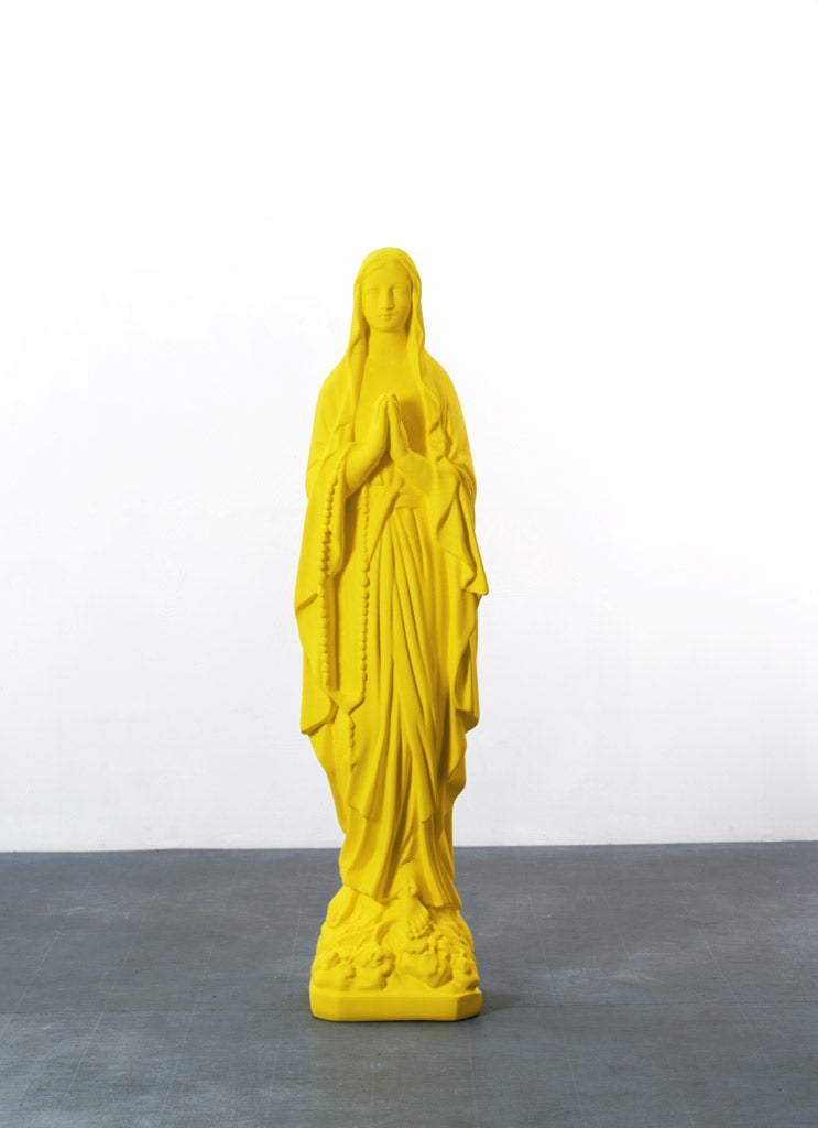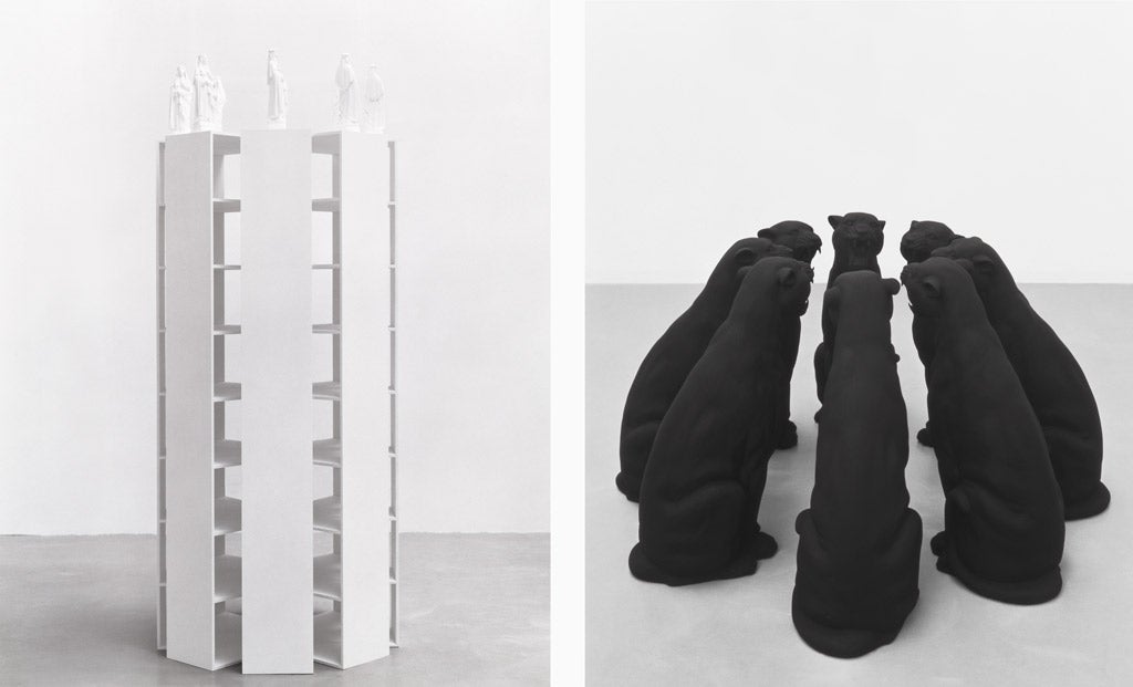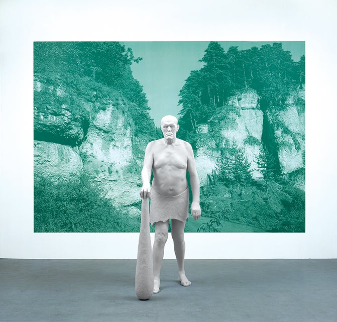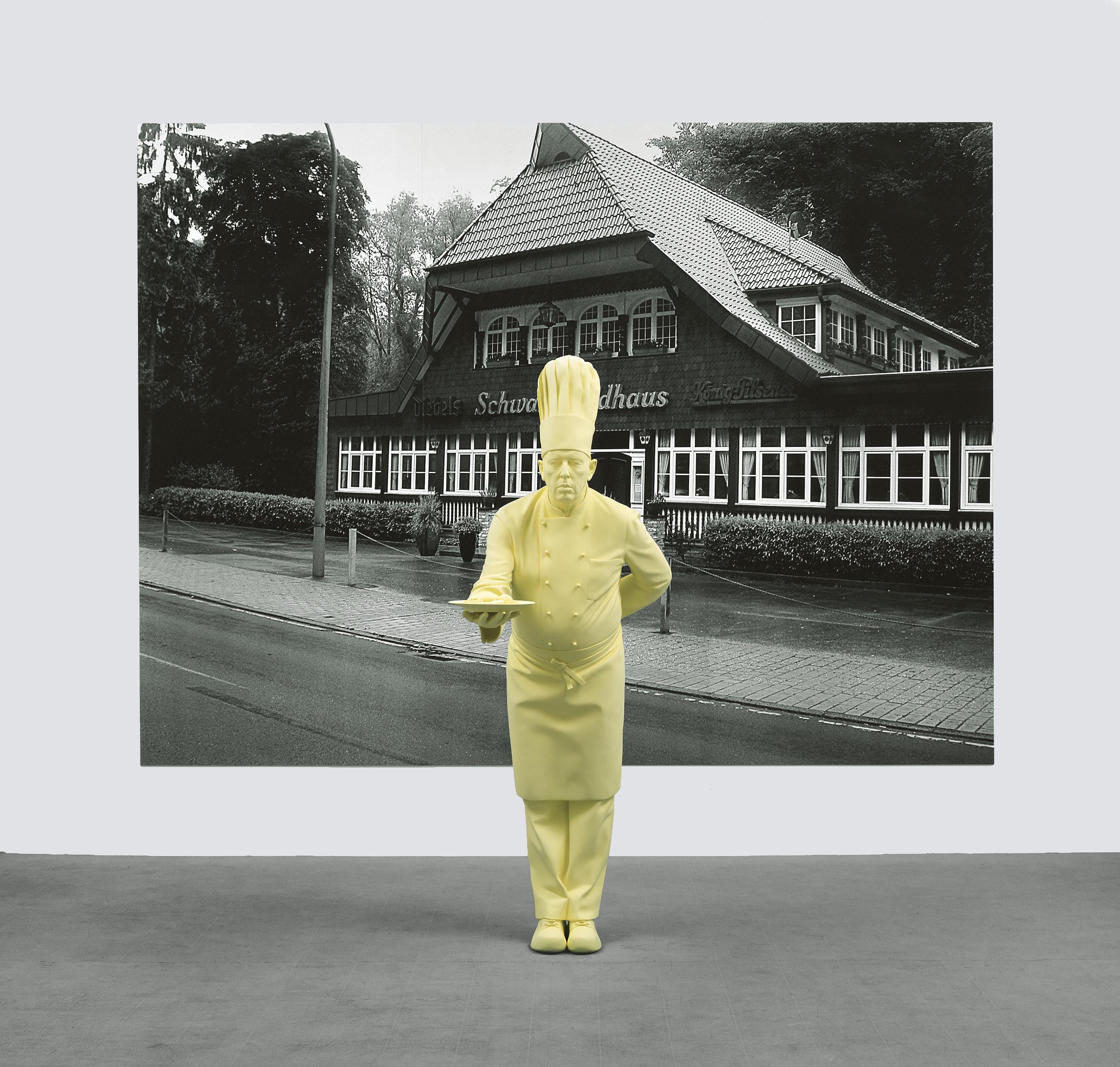 Katharina Fritsch’s extensive sculptural practice transforms familiar subjects through striking shifts of scale, color, and symbolic detail. Fritsch confronts social consciousness from a visual, often iconographic perspective. Her installation-based works reference the ways in which fantasies, fables, and fairy tales impact our cultural understanding. The artist’s sculptures are often described as “uncanny,” an effect due in part to the hyper-saturated finish the artist achieves by repeated layering of monochromatic paint, a process by which the surfaces of sculptures become completely unreflective. These figures subvert the traditional role of statues—hers are not celebratory and do not recall a moment of heroism or historical significance. Rather, they emphasize the inimitable and enigmatic, presenting viewers with symbols and associations to be contemplated rather than understood.