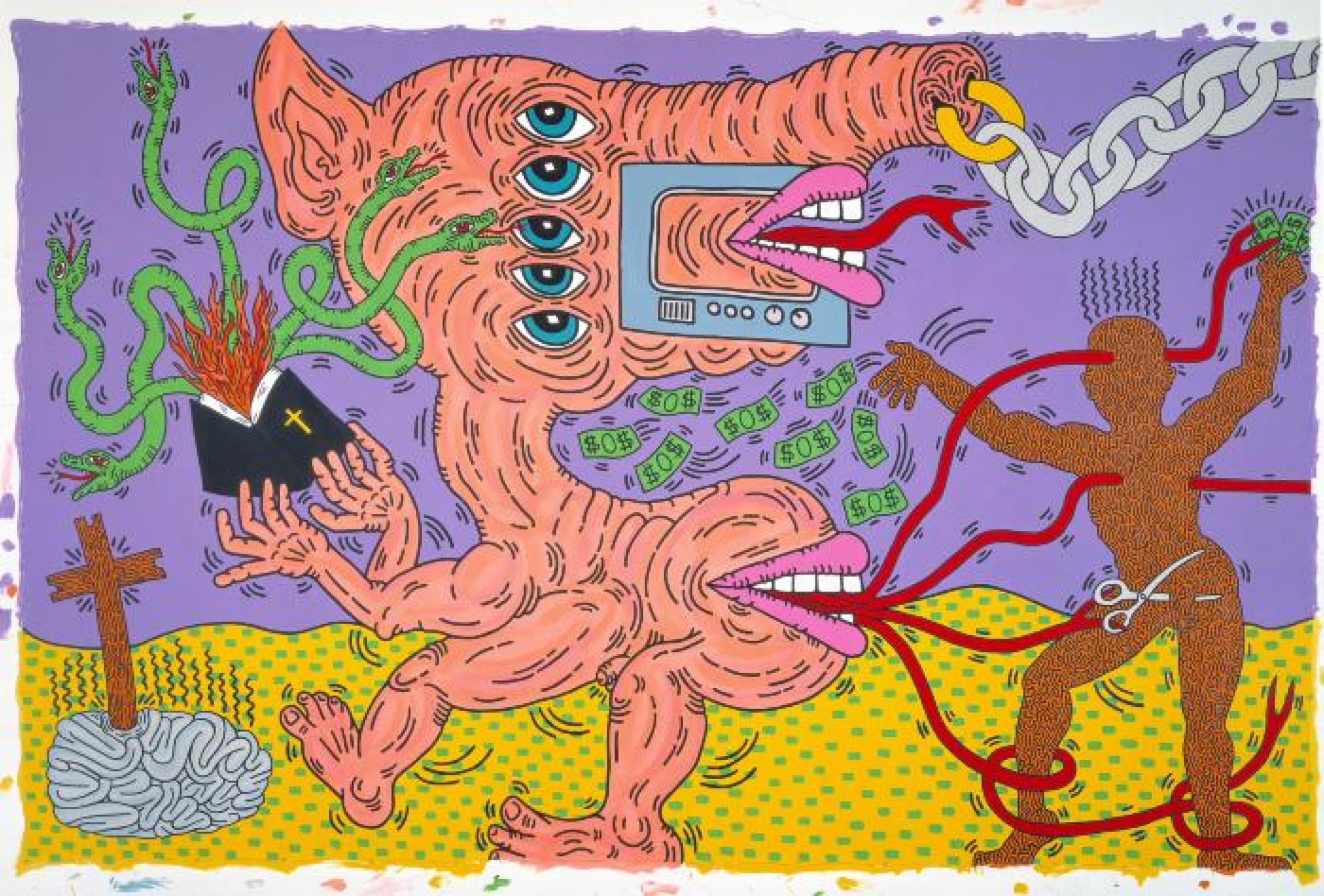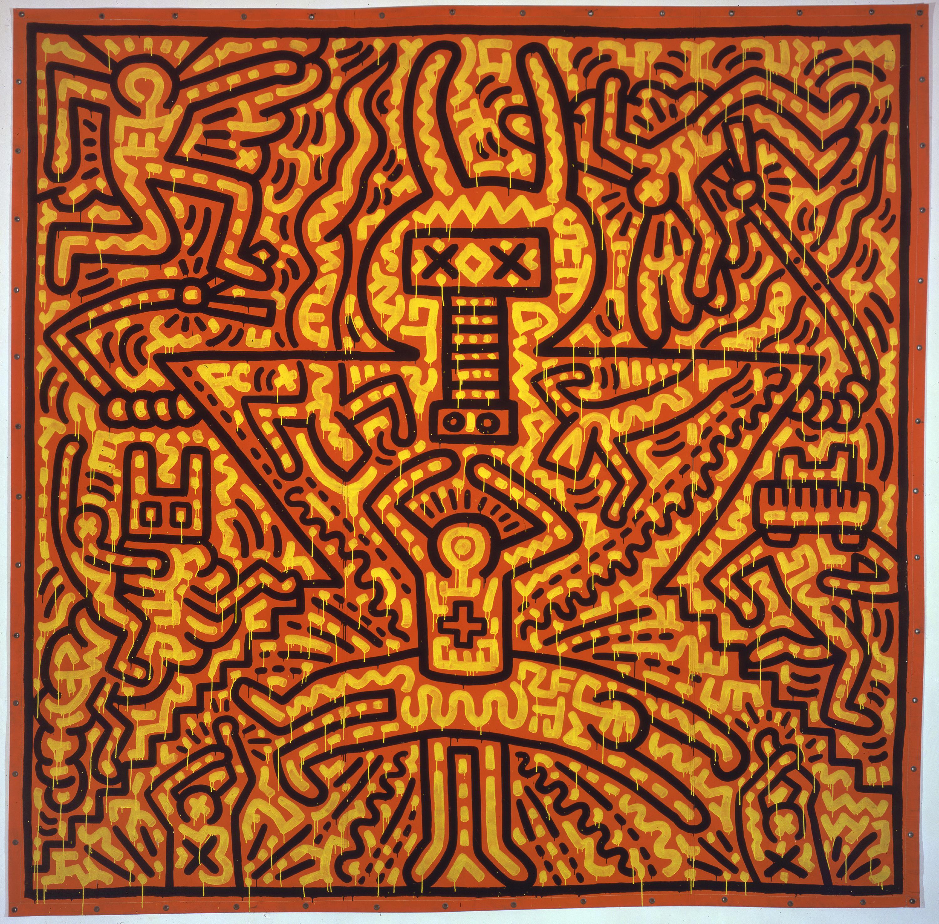 Influenced by his cartoonist father and popular culture, American artist Keith Haring began making art at a young age. Moving from Pennsylvania to New York in the 1980s proved incredibly influential; soon after he arrived in the city Haring was working alongside fellow artists Jean-Michel Basquiat and Kenny Scharf. He developed a highly distinctive style of cartoon-like icons, including dancing figures, barking dogs, and an infant emitting rays of light—his “Radiant Baby.” Haring used this singular visual language as a tool for activism, producing more than 50 public artworks around the world, taking advantage of his increasing fame and influence to support humanitarian causes. Prior to his death at age 31, Haring established the Keith Haring Foundation to support AIDS-related causes and educational initiatives.