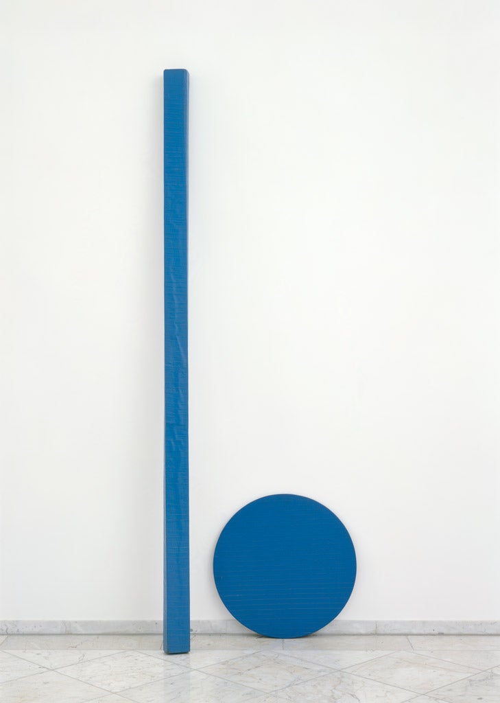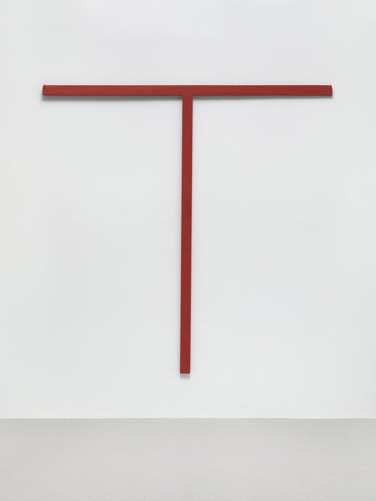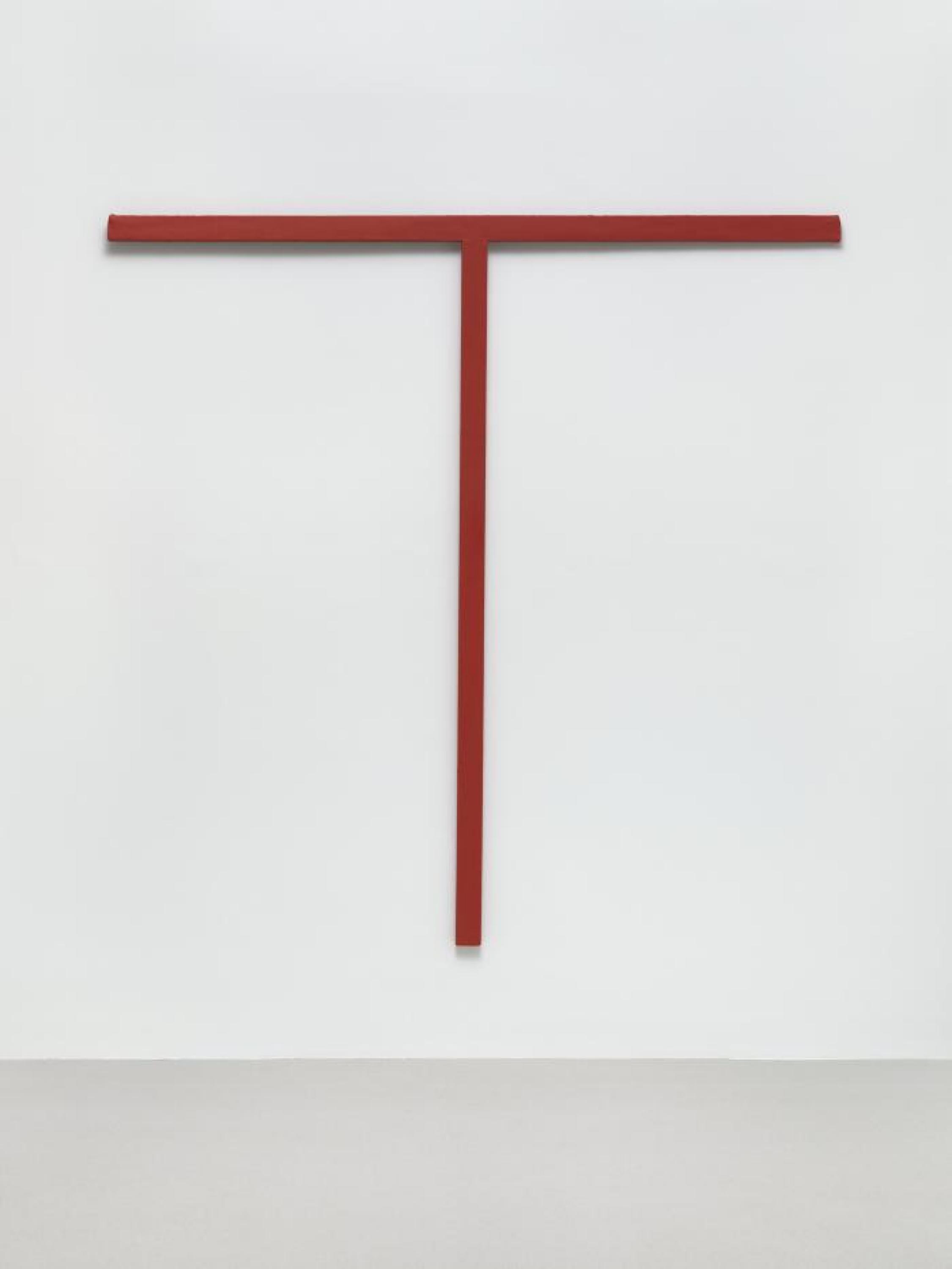 German artist Palermo was among a wave of artists in the 1960s who rejected representational traditions of painting and sculpture, prioritizing textiles, wood, and found materials as his media of choice. He sustained a belief that art, and more specifically painting, aspired to mean more than the sum of its parts. Untitled, 1967, in Glenstone’s collection, is one in a series of “objects” that Palermo made during the 1960s and 1970s that invoke with acumen a tension between painting and sculpture. The piece incorporates many of Palermo’s key motifs, including wooden stretcher strips, triangles, and the use of store-bought muslin. Three wooden strips are wrapped in muslin and painted brown, connecting at irregularly leveled intersections so that the triangular “canvas” pulls taut into three dimensions.