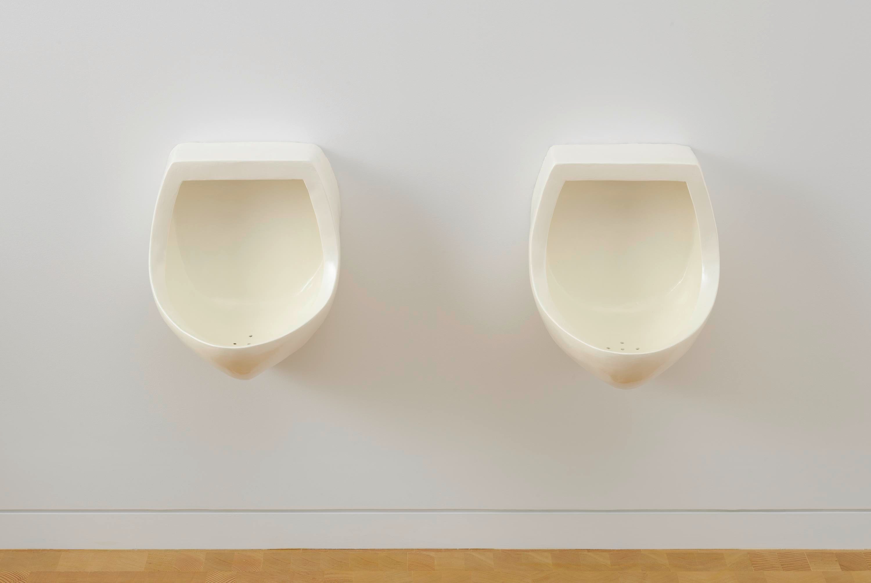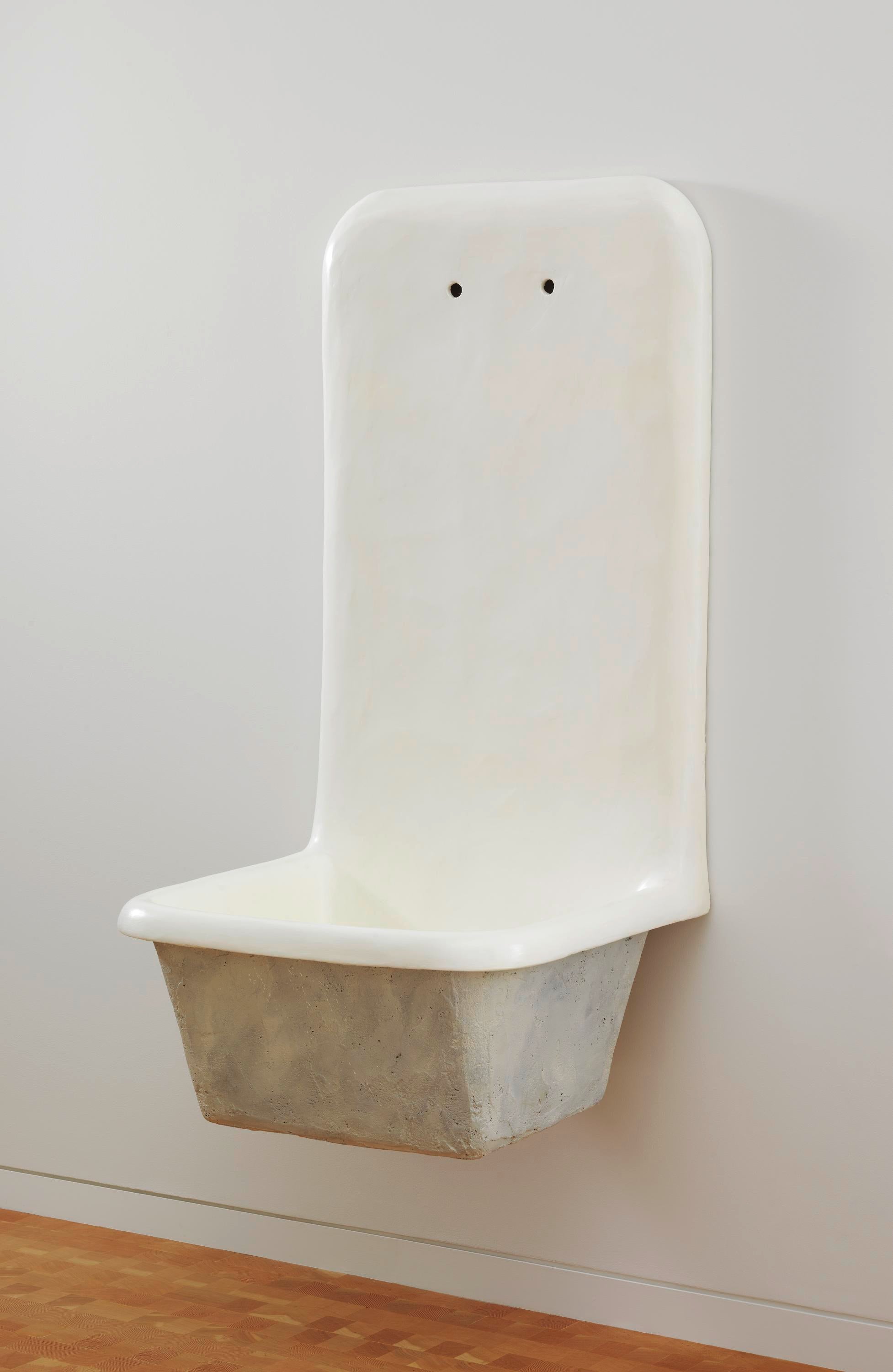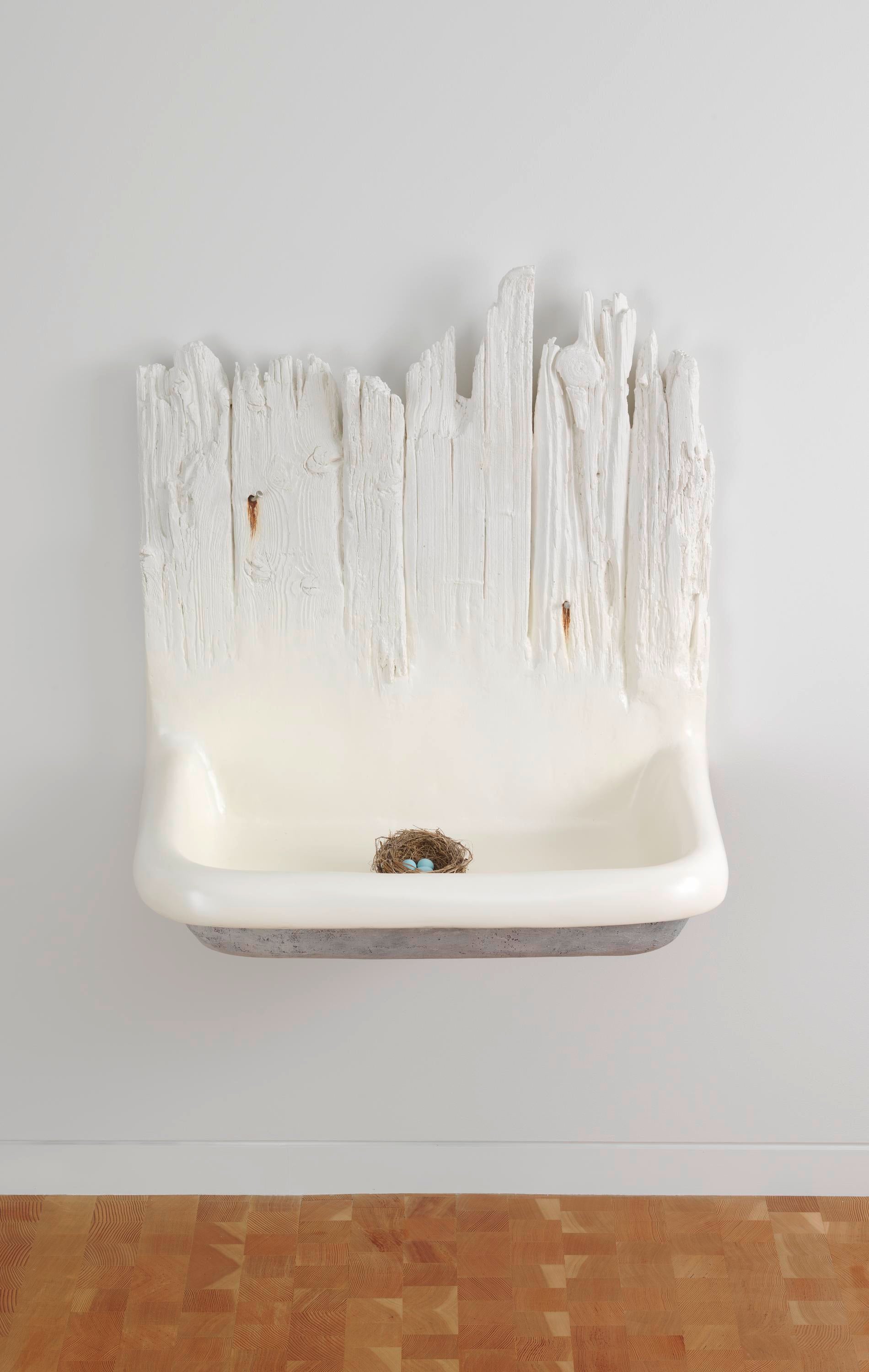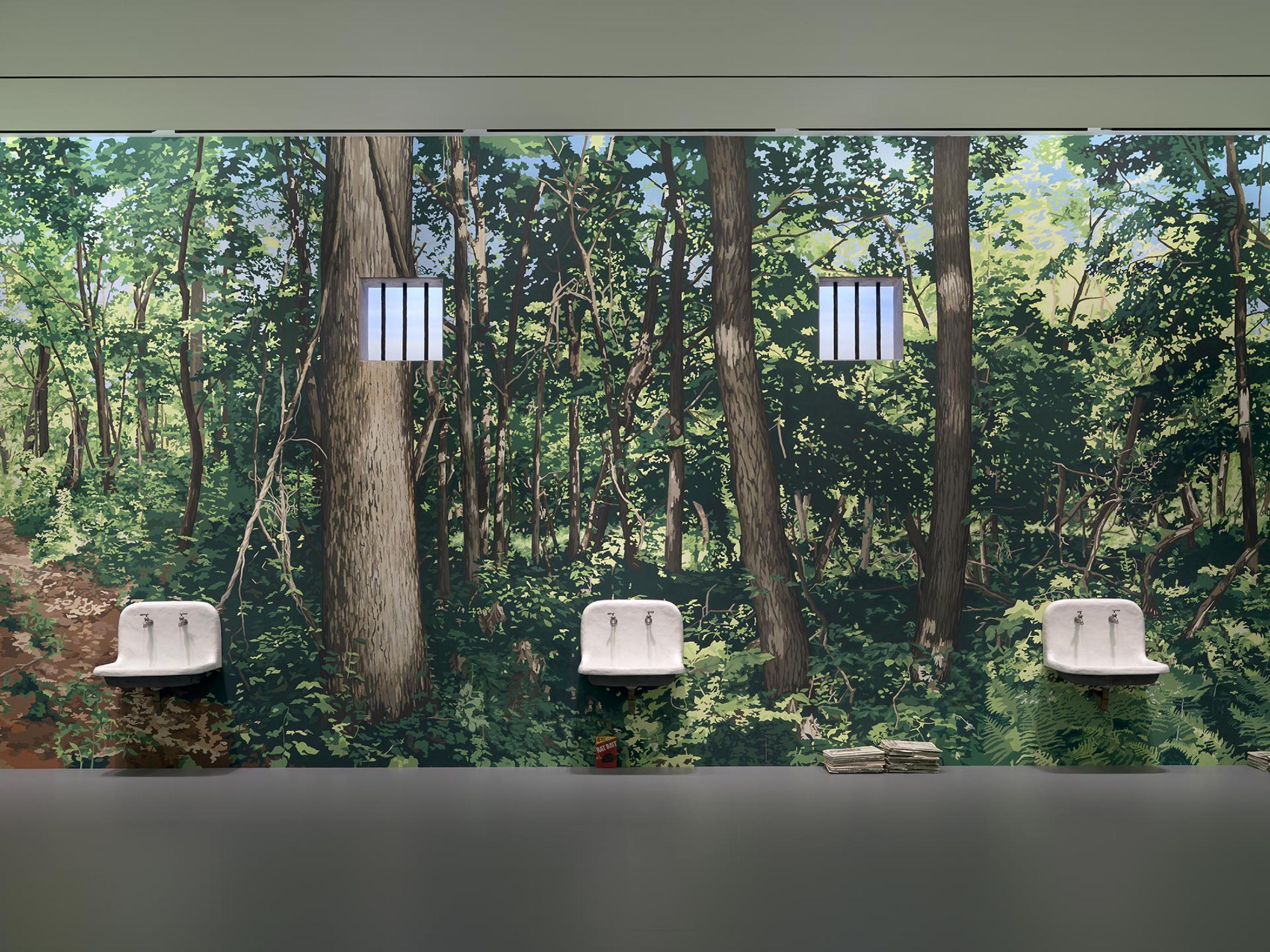 American artist Robert Gober makes sculptural facsimiles of everyday objects that conjure complex associations, from the cultural to the poetic to the political. Untitled, 1992, on long-term view in Room 4 of the Pavilions, features a dark corridor-like space that surrounds an interior room, in which a 360-degree painted mural of a forest provides a backdrop for a series of wall-mounted sinks, whose taps are flowing with a constant stream of water. Gober’s replicas of boxes of rat bait; bound stacks of newspapers, some featuring black and white images of the artist dressed in a wedding gown; and barred prison windows, which reveal a gentle blue sky beyond, round out the assortment of ambiguous symbols in this interior habitat. The artist’s outdoor sculpture Two Partially Buried Sinks, 1986–1987, can be seen nestled among the trees near the Boardwalk along the Woodland Trail.