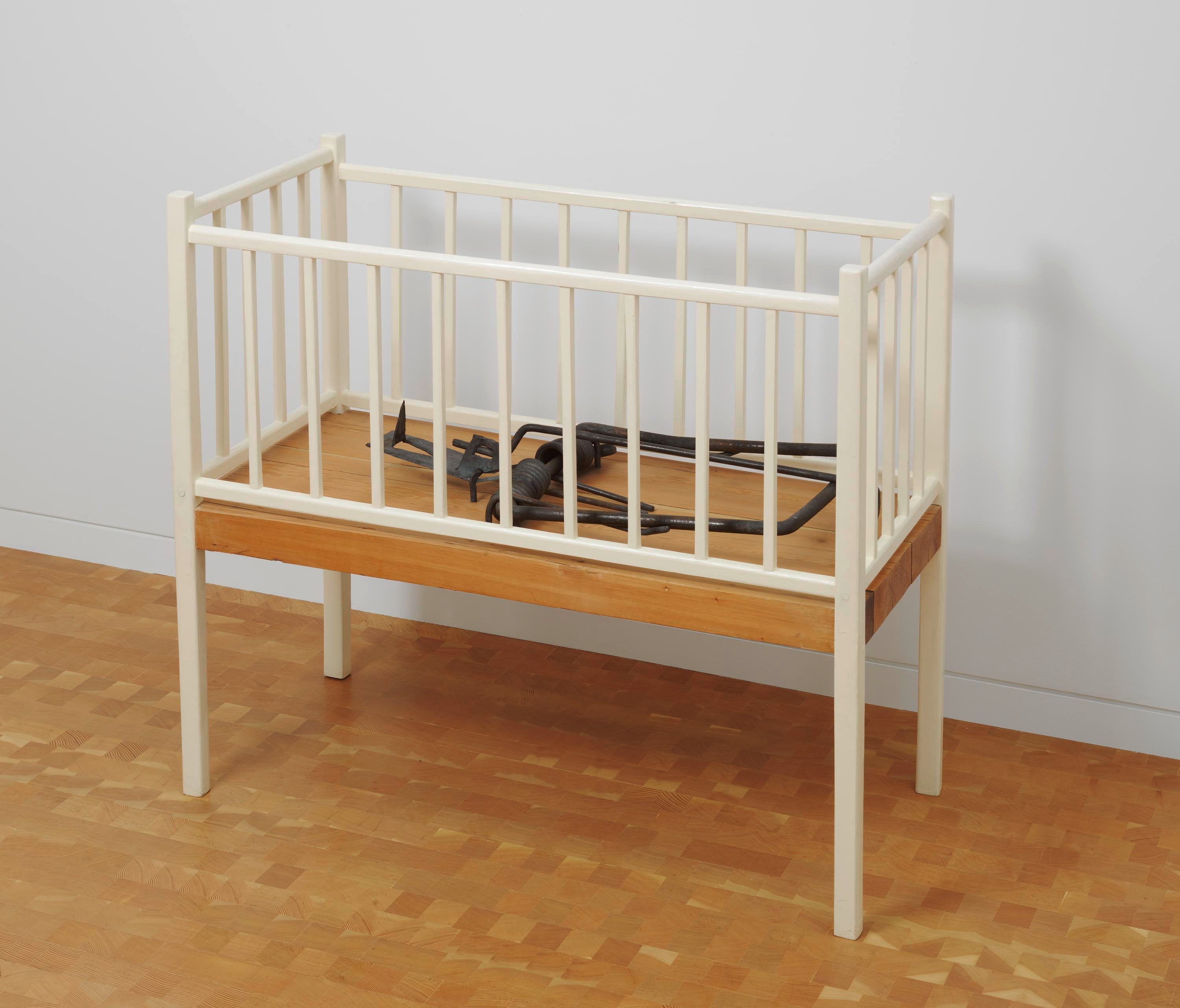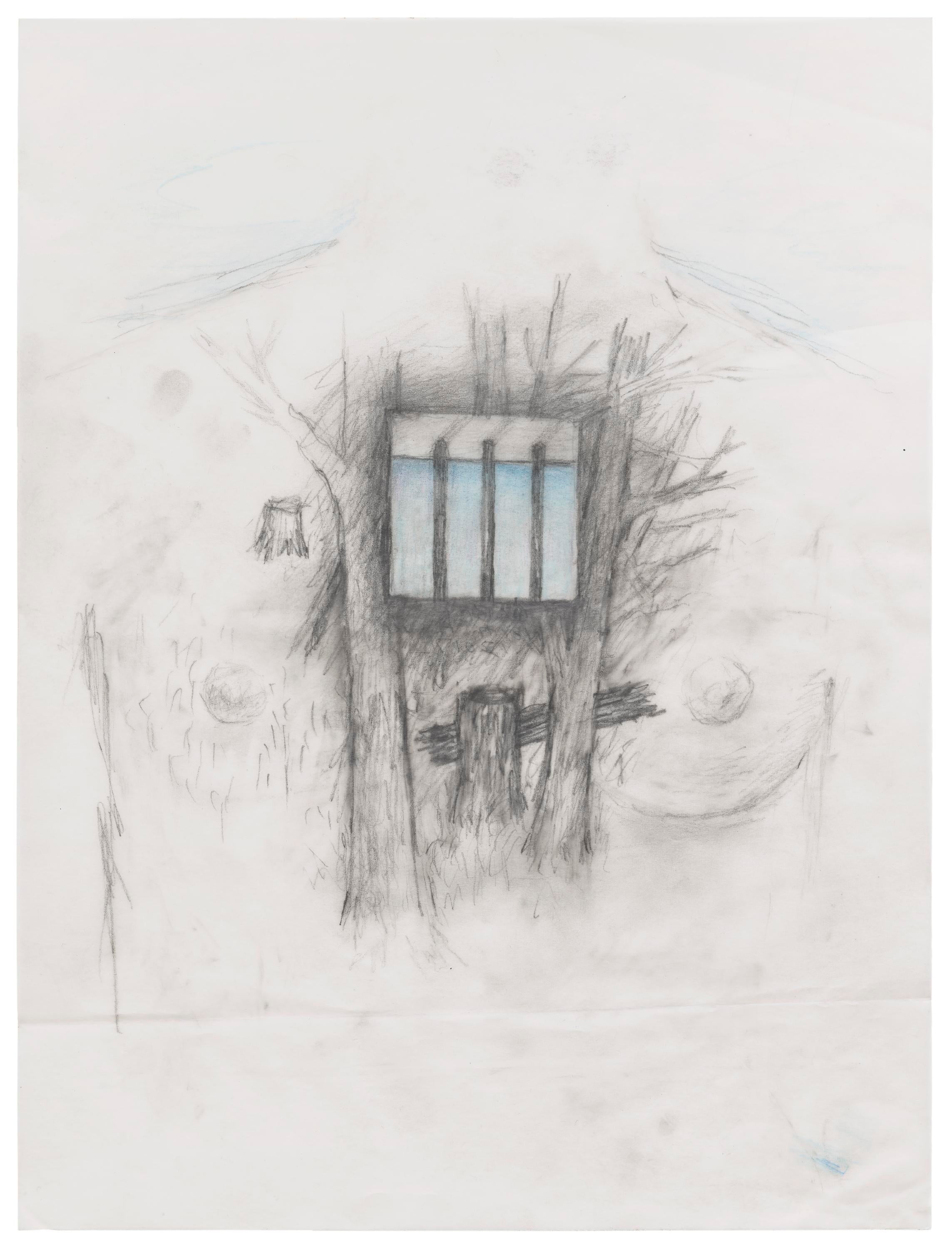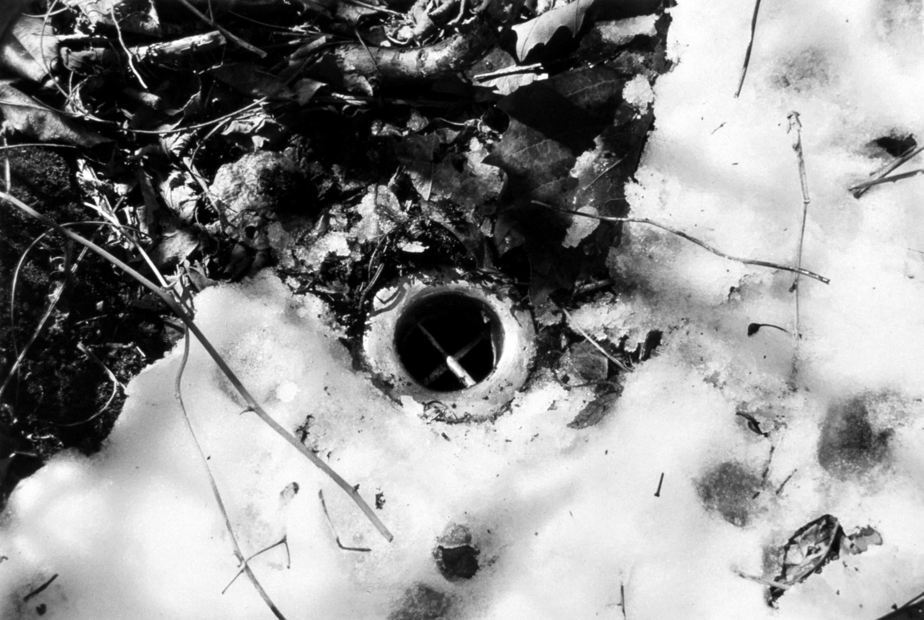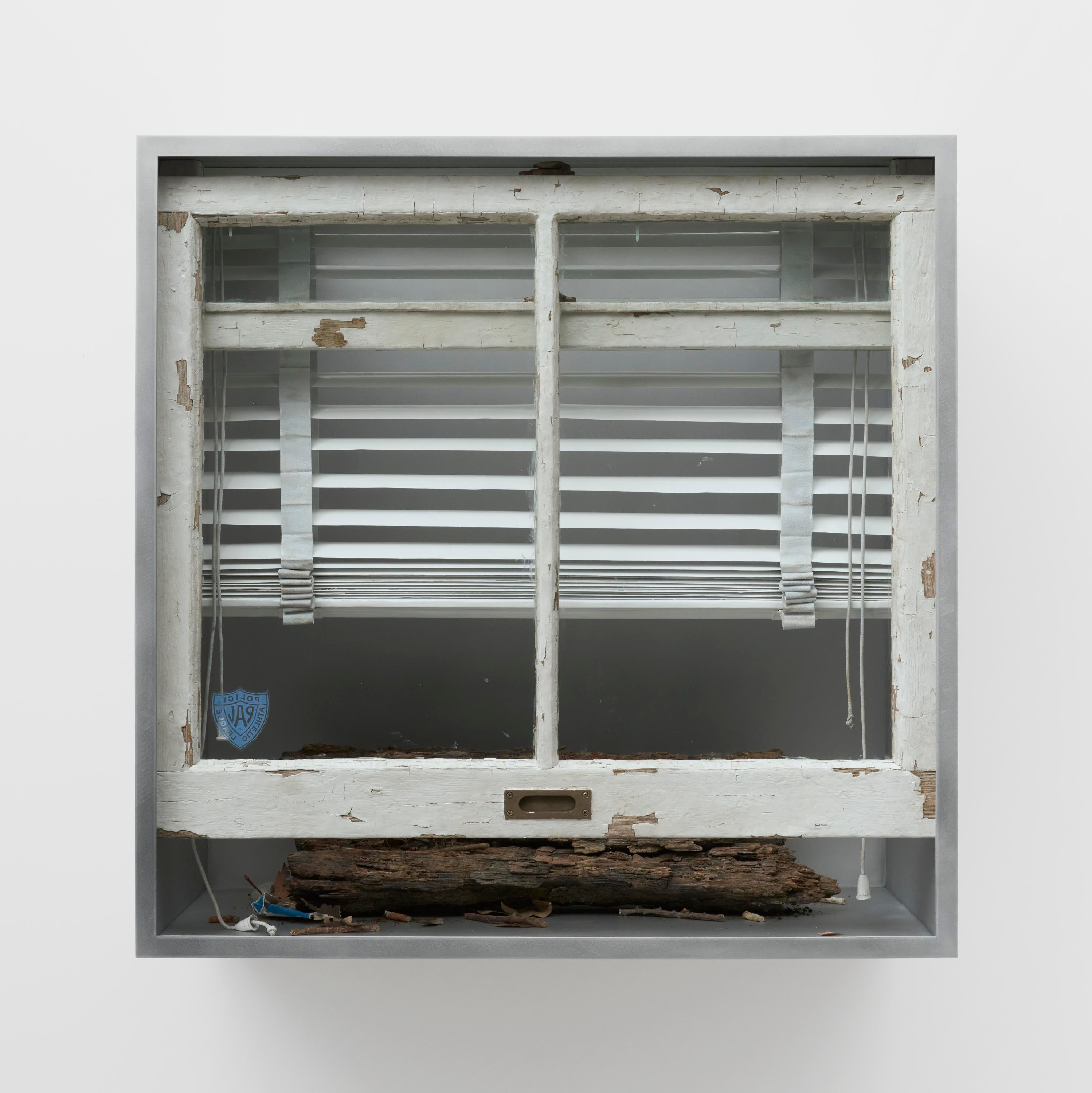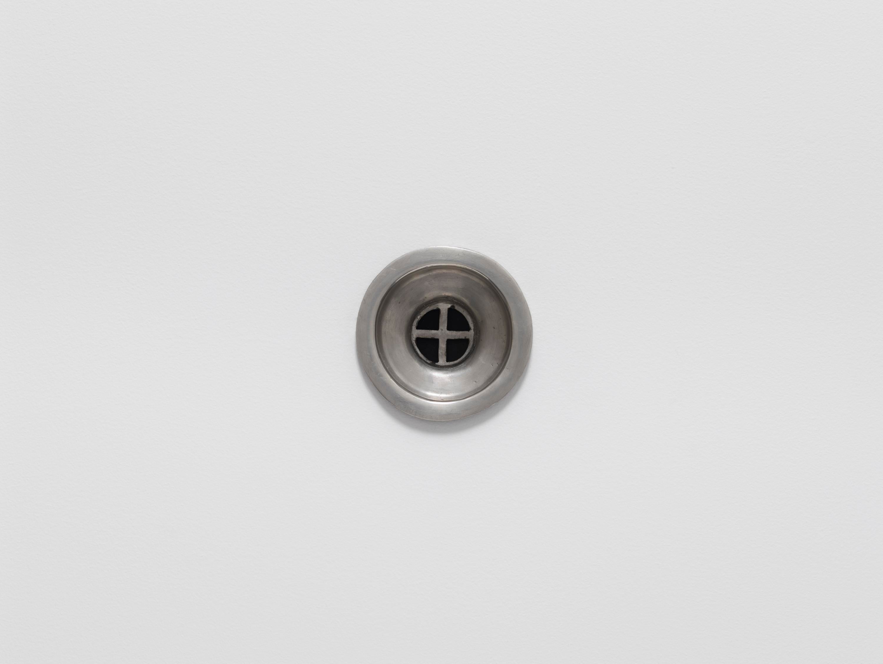 American artist Robert Gober makes sculptural facsimiles of everyday objects that conjure complex associations, from the cultural to the poetic to the political. Untitled, 1992, on long-term view in Room 4 of the Pavilions, features a dark corridor-like space that surrounds an interior room, in which a 360-degree painted mural of a forest provides a backdrop for a series of wall-mounted sinks, whose taps are flowing with a constant stream of water. Gober’s replicas of boxes of rat bait; bound stacks of newspapers, some featuring black and white images of the artist dressed in a wedding gown; and barred prison windows, which reveal a gentle blue sky beyond, round out the assortment of ambiguous symbols in this interior habitat. The artist’s outdoor sculpture Two Partially Buried Sinks, 1986–1987, can be seen nestled among the trees near the Boardwalk along the Woodland Trail.