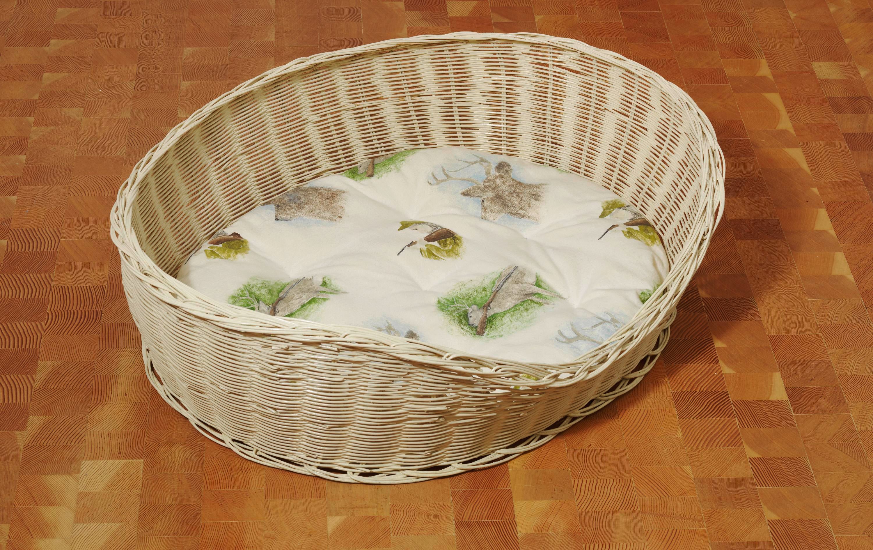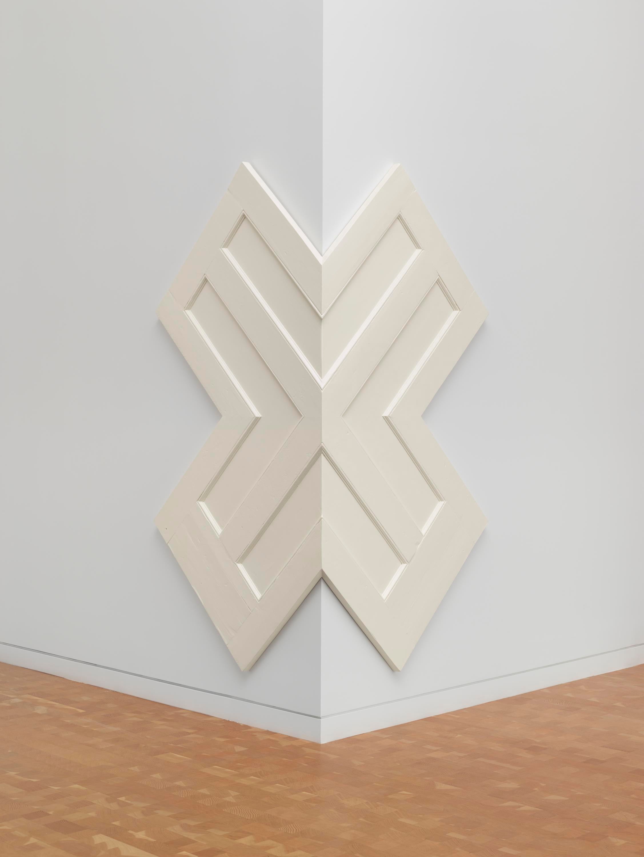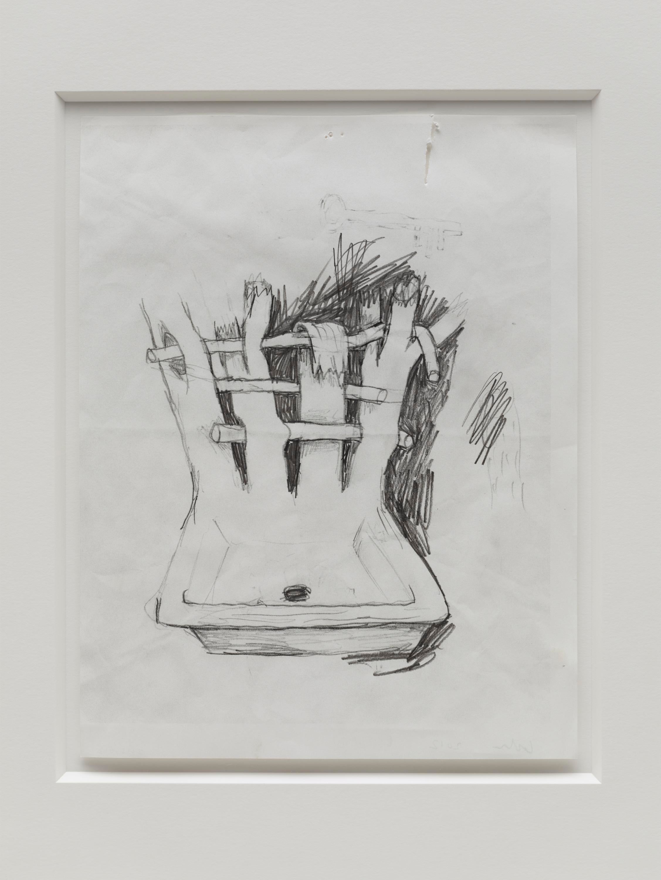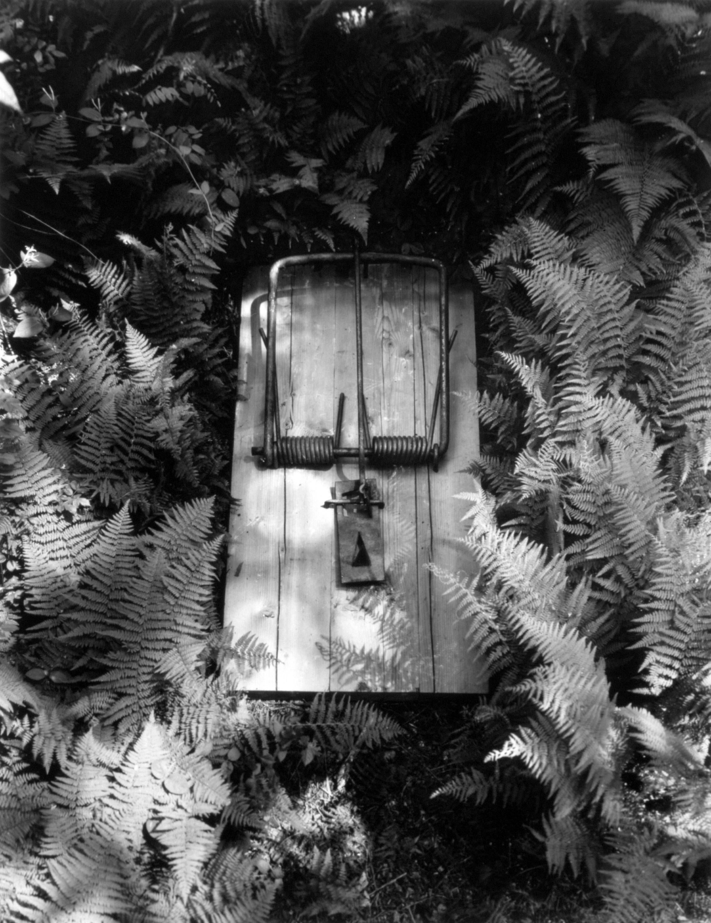American artist Robert Gober makes sculptural facsimiles of everyday objects that conjure complex associations, from the cultural to the poetic to the political. Untitled, 1992, on long-term view in Room 4 of the Pavilions, features a dark corridor-like space that surrounds an interior room, in which a 360-degree painted mural of a forest provides a backdrop for a series of wall-mounted sinks, whose taps are flowing with a constant stream of water. Gober’s replicas of boxes of rat bait; bound stacks of newspapers, some featuring black and white images of the artist dressed in a wedding gown; and barred prison windows, which reveal a gentle blue sky beyond, round out the assortment of ambiguous symbols in this interior habitat. The artist’s outdoor sculpture Two Partially Buried Sinks, 1986–1987, can be seen nestled among the trees near the Boardwalk along the Woodland Trail.
