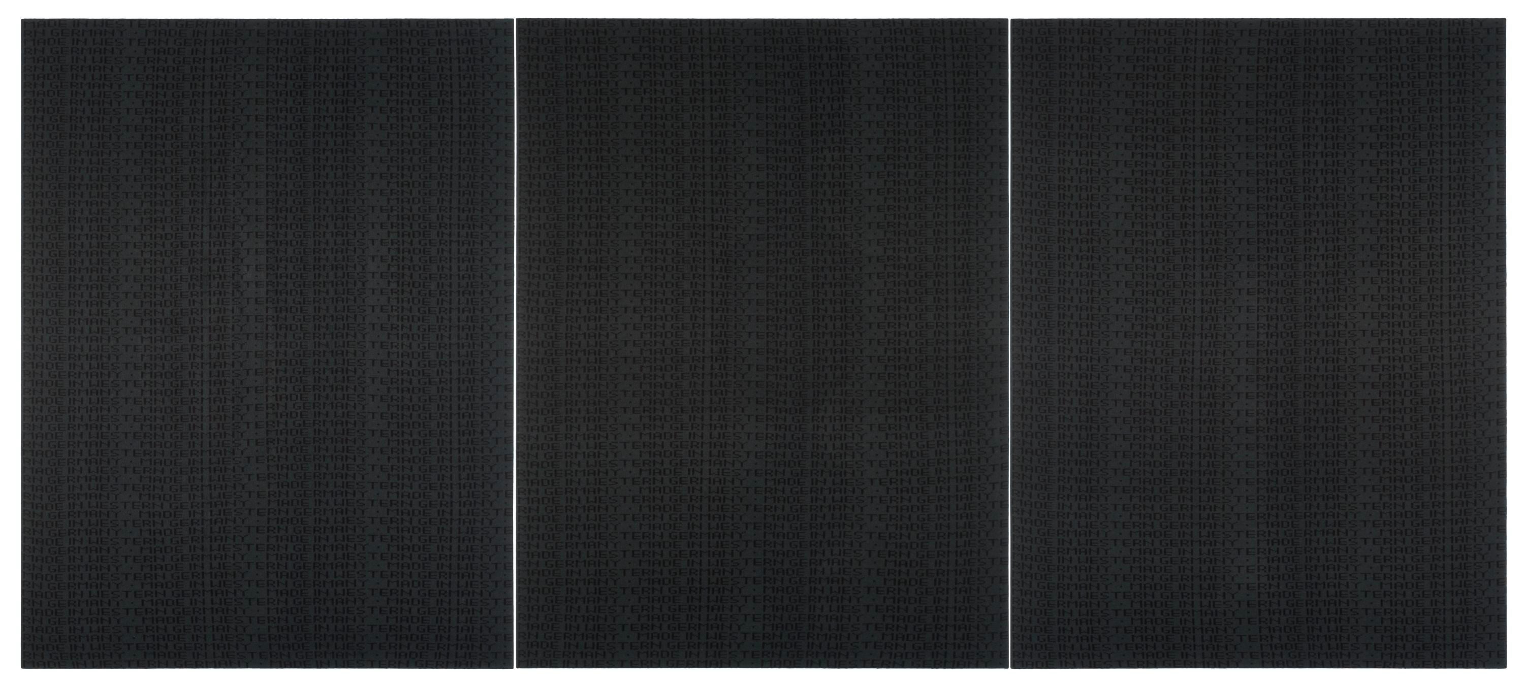 German artist Rosemarie Trockel’s diverse practice draws from a variety of sources, including technology, natural history, politics, and popular culture. While her oeuvre includes film, video, ceramics, clothing, drawing, collage, and sculpture, she is best known for her knitted works, which engage both the history of the Cold War and deep-seated gender norms by transforming material commonly associated with “women’s work” into fine art. This repositioning is visible in works such as Untitled (Made in Western Germany), 1987, in Glenstone’s collection. Made two years before Germany’s reunification, from a distance the knitted triptych reads like a monochromatic painting—shades of black on three panels. Upon closer inspection, it reveals a more complicated form: the machine-knitted wool is pulled taut on a wood frame, revealing the repeated phrase MADE IN WESTERN GERMANY.