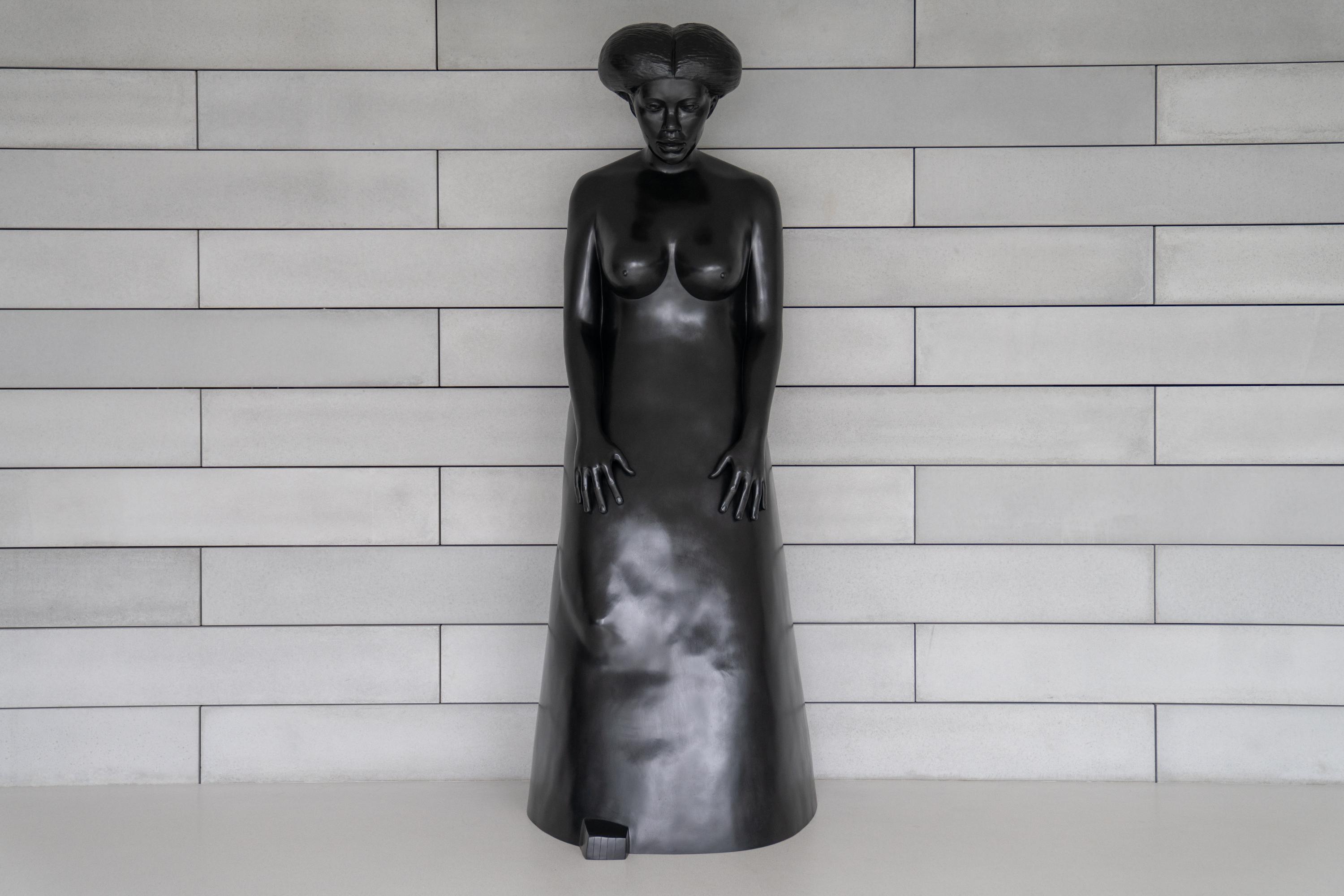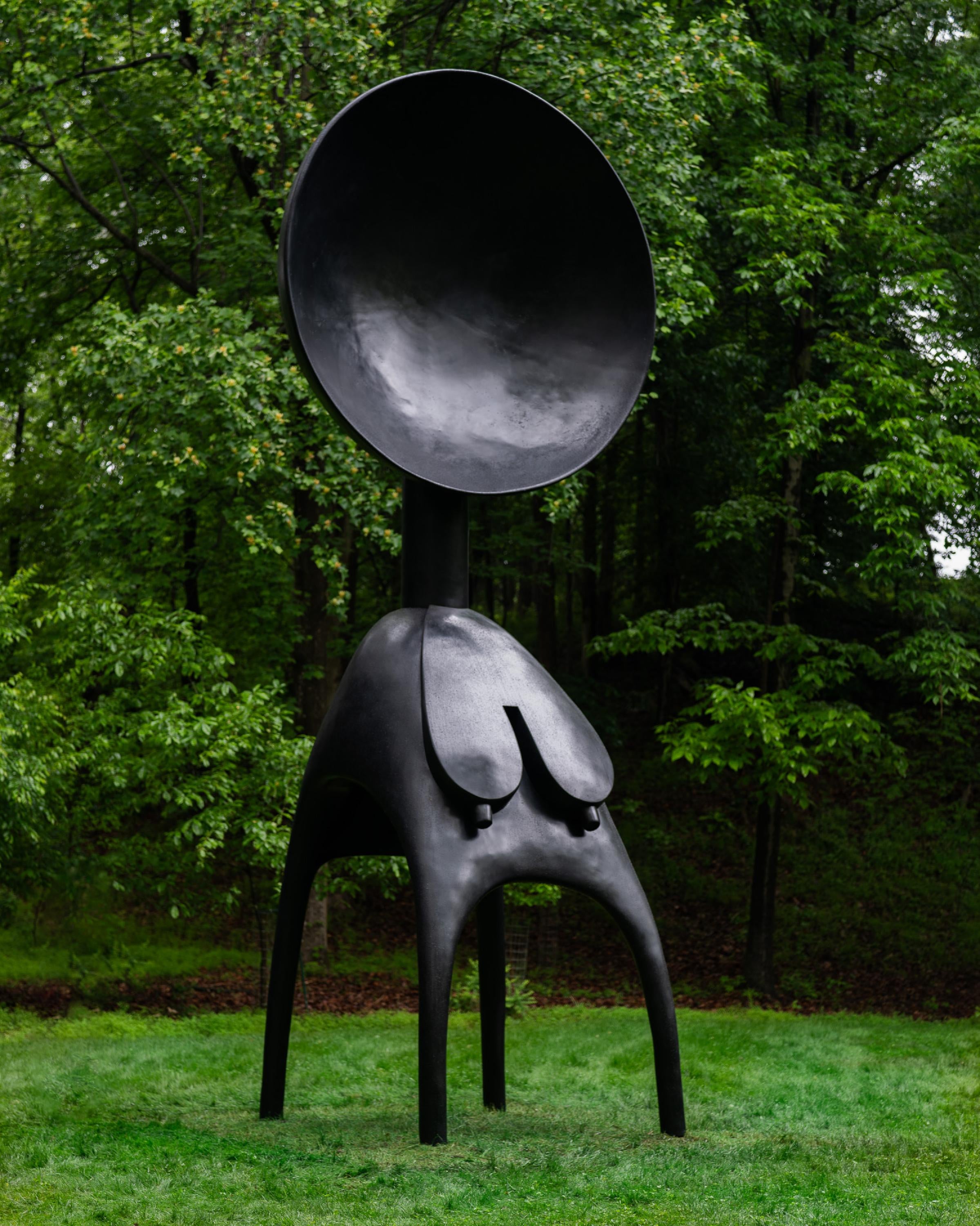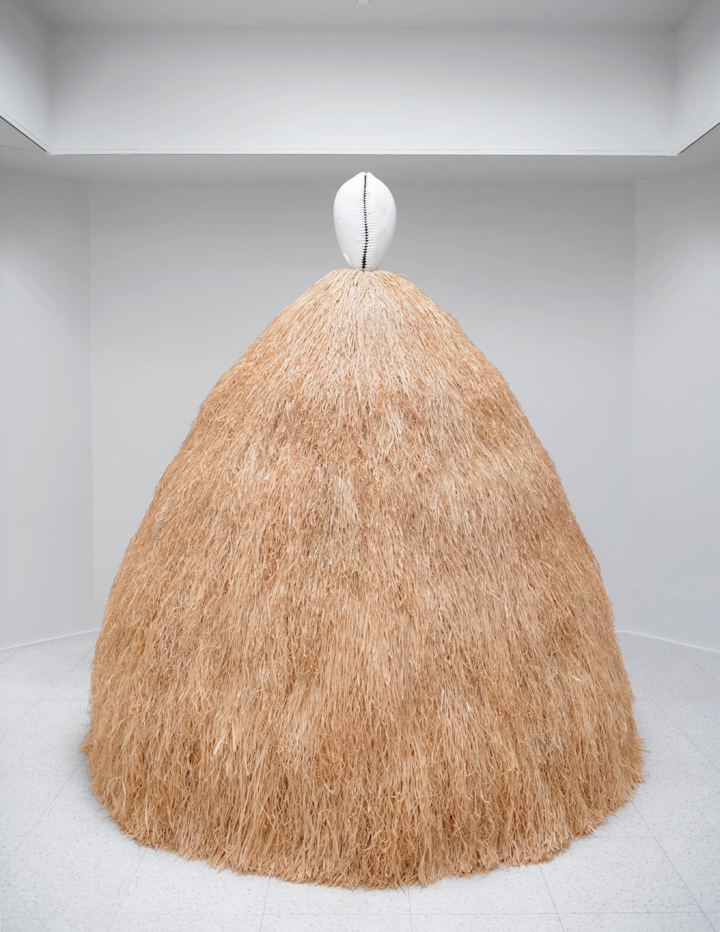 For more than two decades, Simone Leigh has interrogated the past and present of Black femme subjectivity through sculpture, video, and performance. Leigh describes her work as “autoethnographic,” focused on research and self-reflection, inspired by a range of African and Black American material cultures. Among several works in Glenstone’s collection is Village Series, 2021, a sculpture measuring over seven feet tall. The towering figure emerges defiantly from a hoop skirt with arms bent, fists to hips, head tilted down. Echoing other works in Leigh’s oeuvre, she dances between abstraction and figuration. In lieu of facial features, a wreath of hand-built ceramic rosettes frames a black, concave space reminiscent of Leigh’s first love, ceramic vessels.