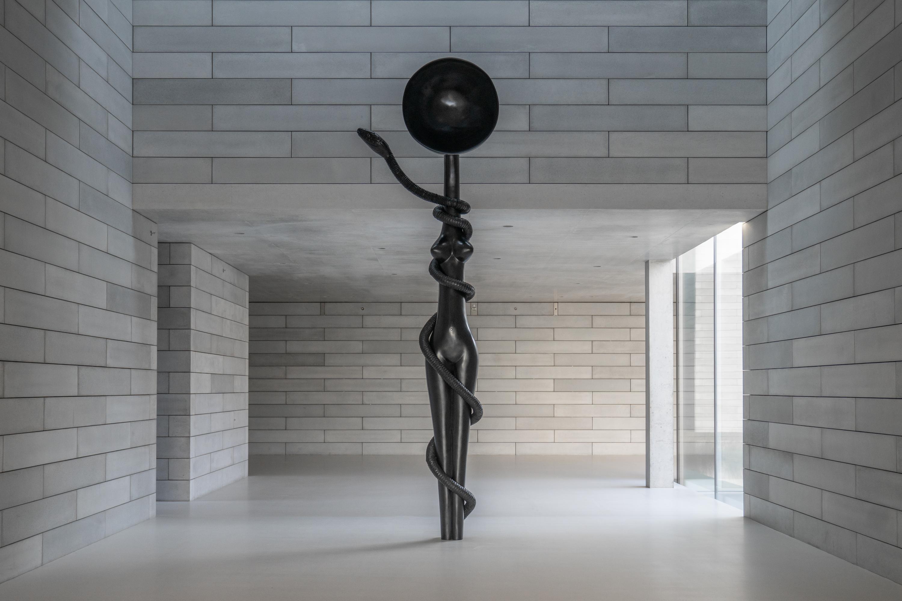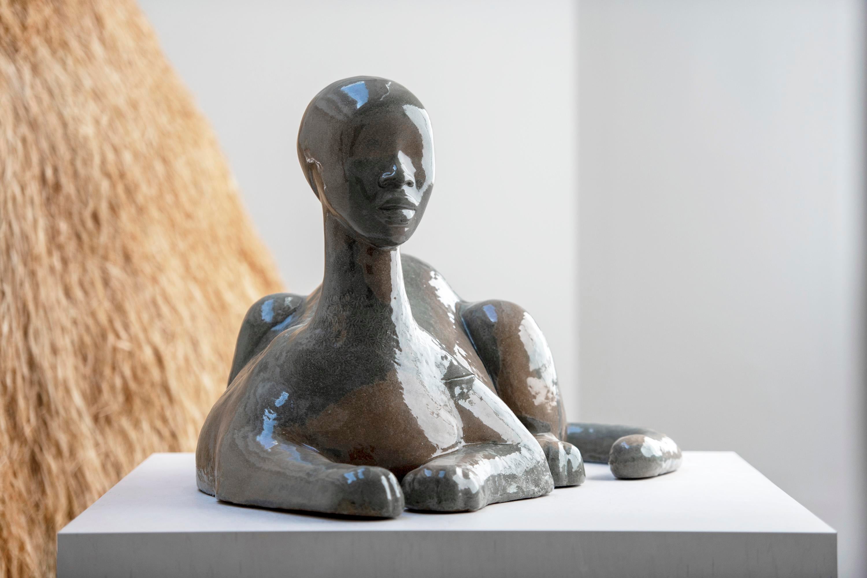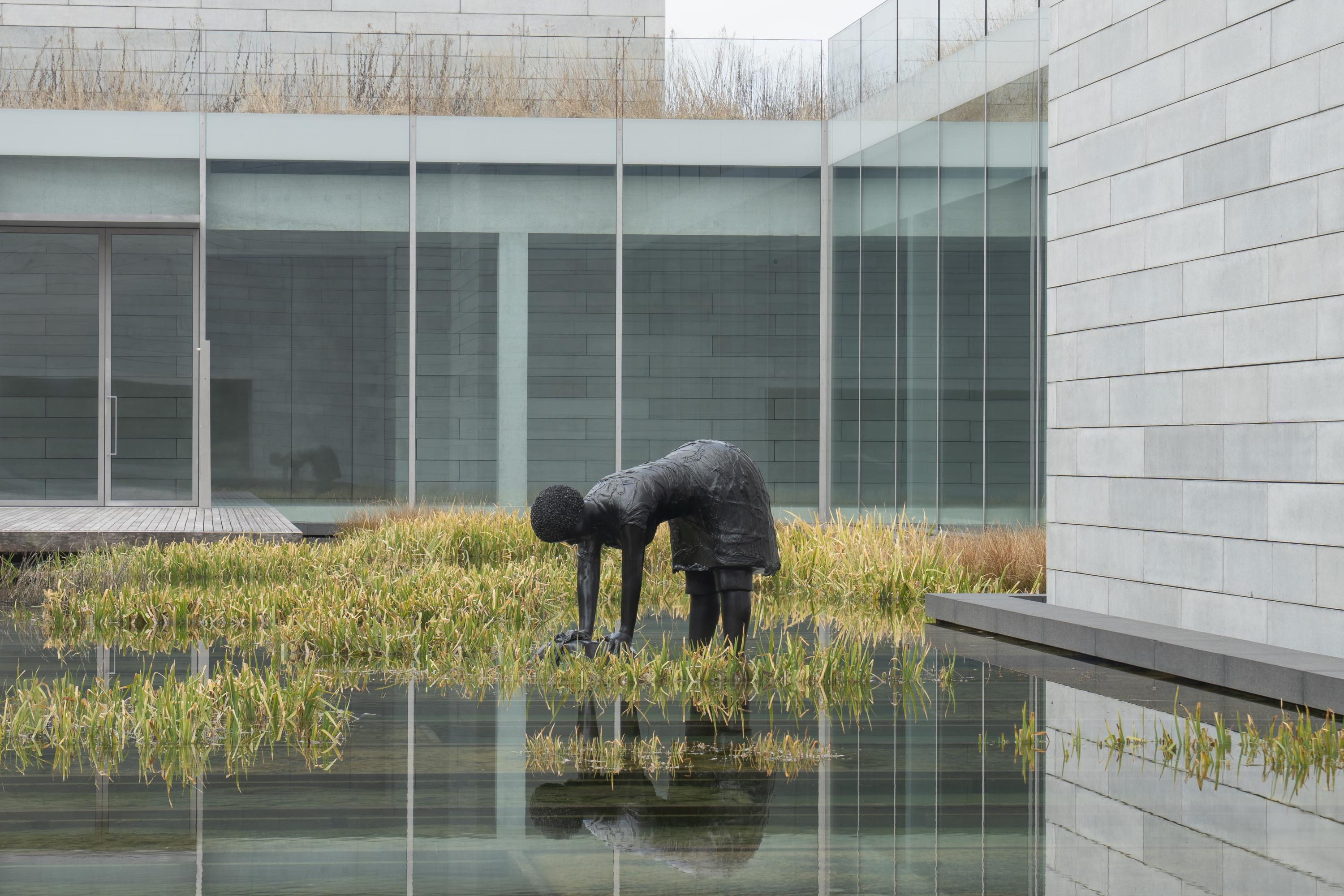 For more than two decades, Simone Leigh has interrogated the past and present of Black femme subjectivity through sculpture, video, and performance. Leigh describes her work as “autoethnographic,” focused on research and self-reflection, inspired by a range of African and Black American material cultures. Among several works in Glenstone’s collection is Village Series, 2021, a sculpture measuring over seven feet tall. The towering figure emerges defiantly from a hoop skirt with arms bent, fists to hips, head tilted down. Echoing other works in Leigh’s oeuvre, she dances between abstraction and figuration. In lieu of facial features, a wreath of hand-built ceramic rosettes frames a black, concave space reminiscent of Leigh’s first love, ceramic vessels.