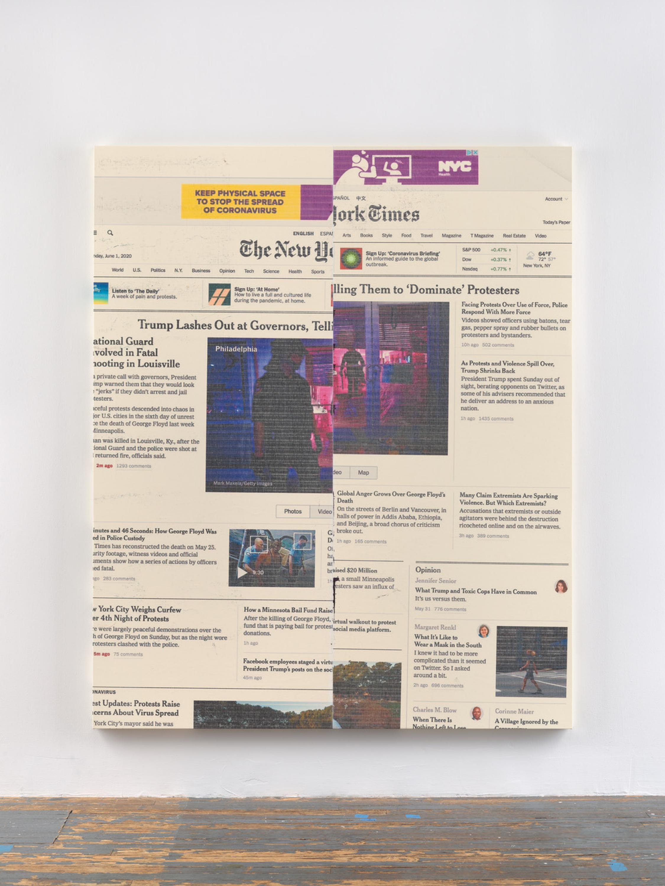 Using a computer and printer as his paintbrushes, Wade Guyton creates artwork that considers the evolving relationship between original images and their reproductions. He is best known for intentionally misusing printer technology, forcing primed linen through inkjet printers, then stretching the resulting canvases like traditional paintings. Overworking the printer, each painting leaves behind traces of its production. Employing this technique for the suite of 26 paintings that comprise Untitled, 2020–2021, in Glenstone’s collection, Guyton presents a dizzying array of images—screenshots, personal photos, and colorful bitmap files—presented as sculptural stacks leaning against the wall. Made during the early months of the COVID-19 pandemic, the paintings purposefully obscure their imagery, reflecting the collective isolation and uncertainty of the time.