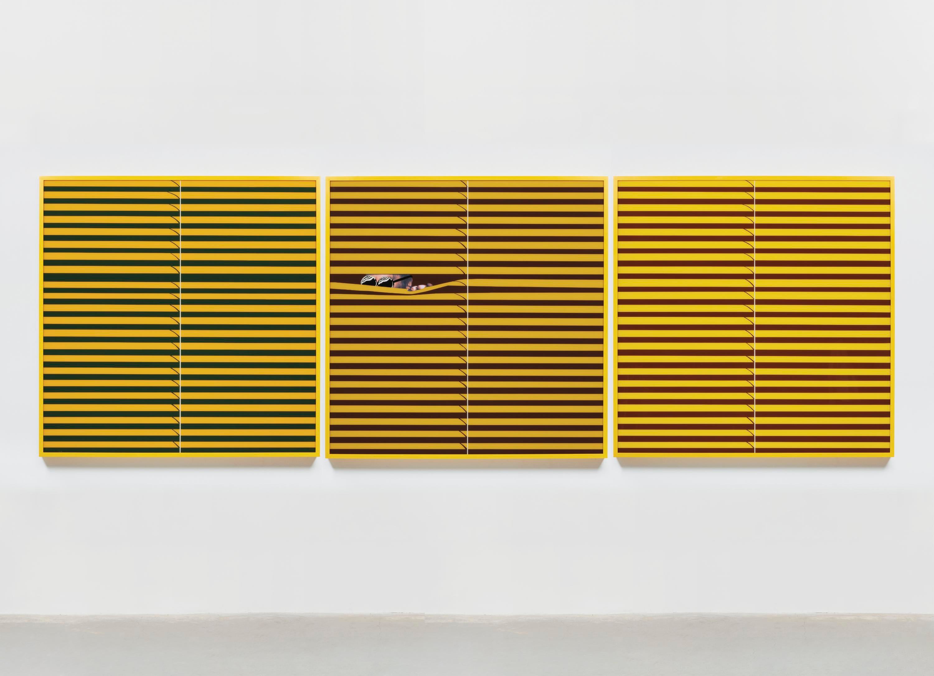 digital prints on poplin, Plexiglas, spray paint, vinyl decal, sequin prints, foam, velvet, hardware and wooden frames