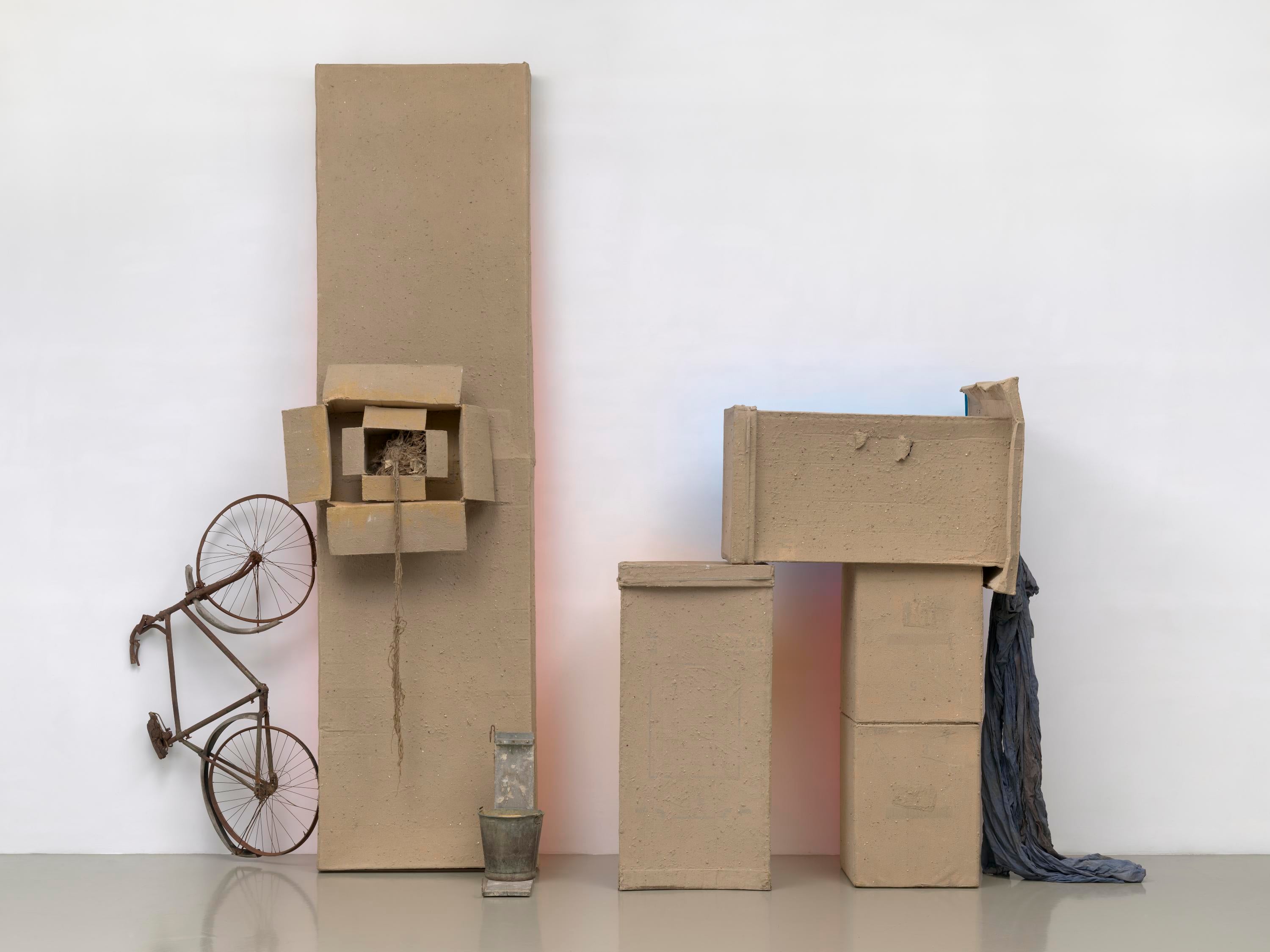 sand and acrylic on cardboard with bicycle, fabric, twine, metal bucket, and wood