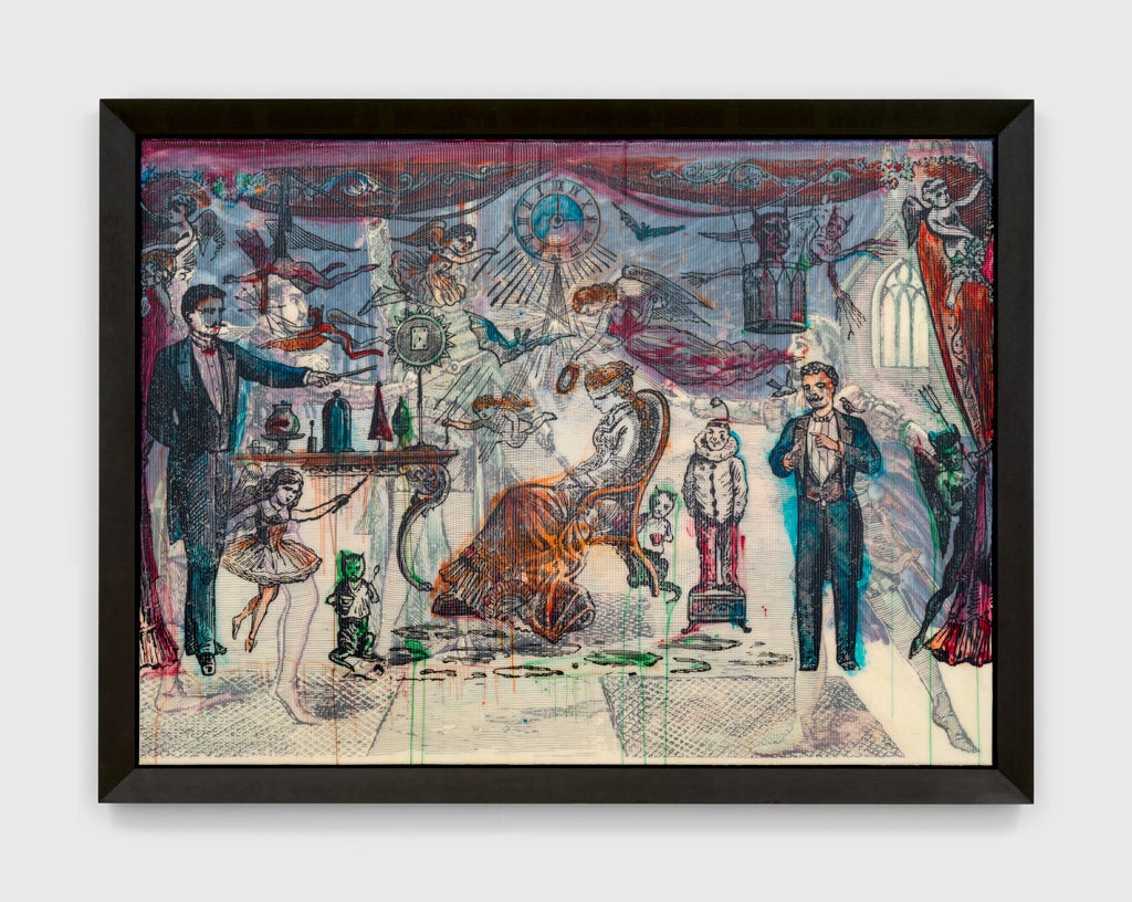 gouache, gold bronze, spray paint, and enamel on paper mounted on canvas