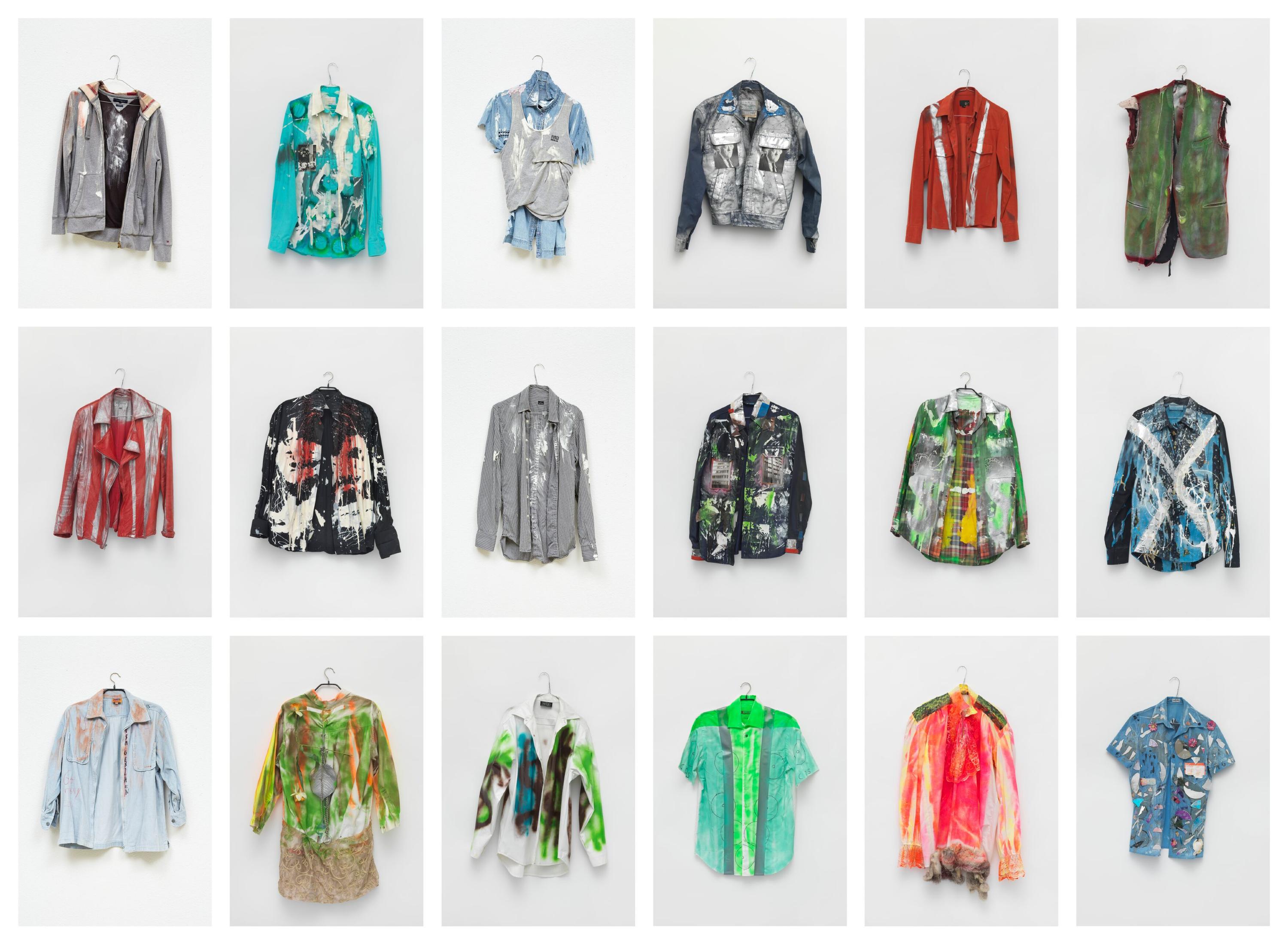 Hemd / Jacke, 1998, by German artist Isa Genzken (b. 1948) is comprised of eighteen painted and collaged shirts and jackets on wire hangers, a key example from the artist’s radically inventive approach to materials. The work transforms found material—in this case, clothing worn by the artist—into dynamic objects that recall the entrancing energy of dance clubs and urban nightlife while critiquing the relentless cycle of consumer culture and mass production. Blurring the line between painting and sculpture, this work was mounted across a series of precast concrete blocks in the Passage of the Pavilions.