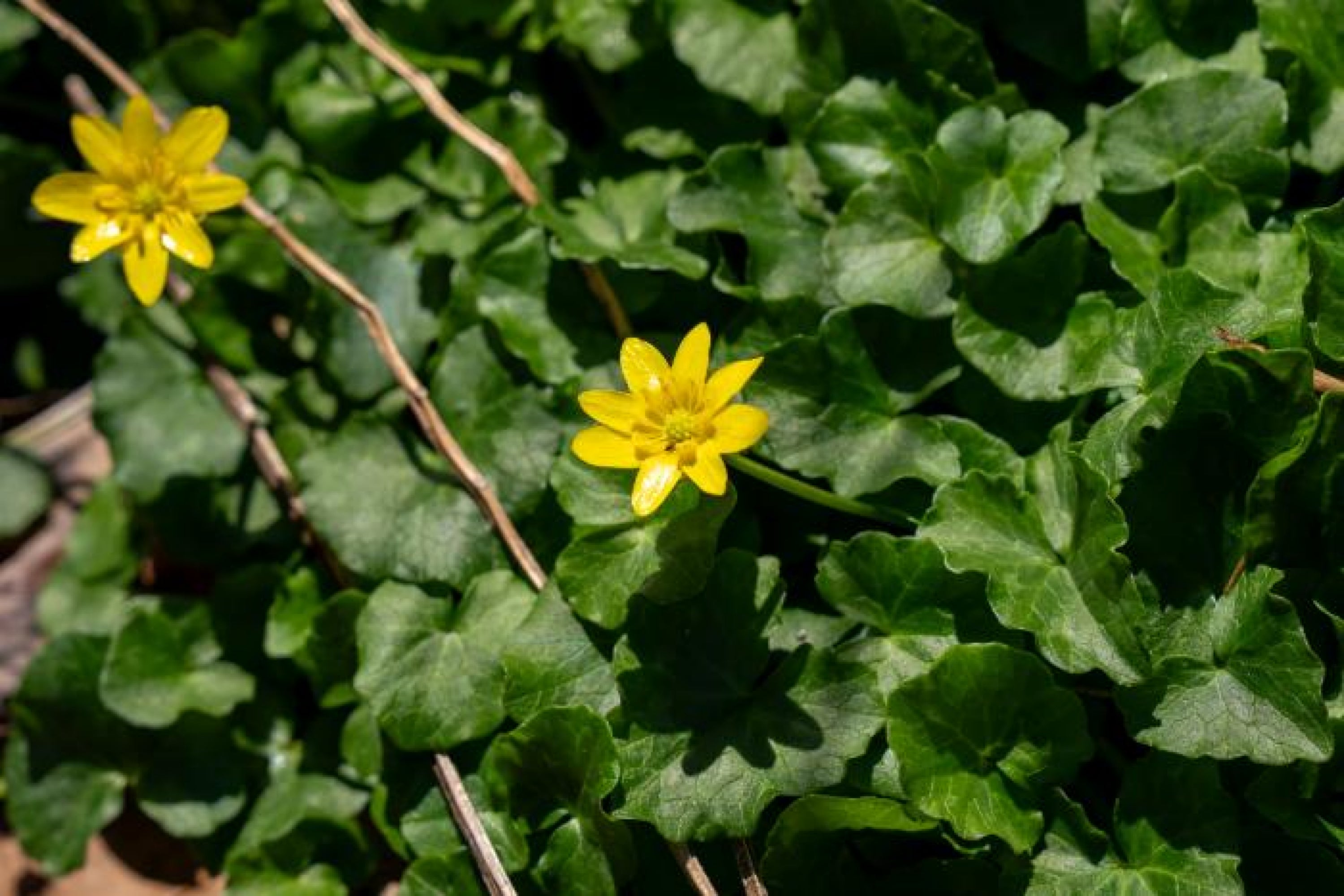 It's easy to miss bloodroot (Sanguinaria canadensis) on the forest floor—the tiny white flowers stand only a few inches high. Nevertheless, they poke through the leaf litter to create a bright white-and-yellow display for spring pollinators. Named for the red sap emitted by their root when cut, bloodroot is a member of the poppy family. It is also distinguished by its single green, waxy, multi-lobed leaf. When the plant emerges in early spring, this leaf is tightly curled around the bloom. After the plant blooms, the petals fall away and the leaf grows larger (sometimes six or more inches across) as it gathers sunlight for next year, storing it in the eponymous root. The foliage is not tasty to deer, but the seeds are dispersed by ants, who consume the protein-rich material surrounding the seed. This helps the plant spread. At Glenstone, the plant can be seen on the sloped part of the Woodland Trail between Andy Goldsworthy’s Clay Houses (Boulder-Room-Holes), 2007, and Simone Leigh’s Satellite, 2022, in very early spring.