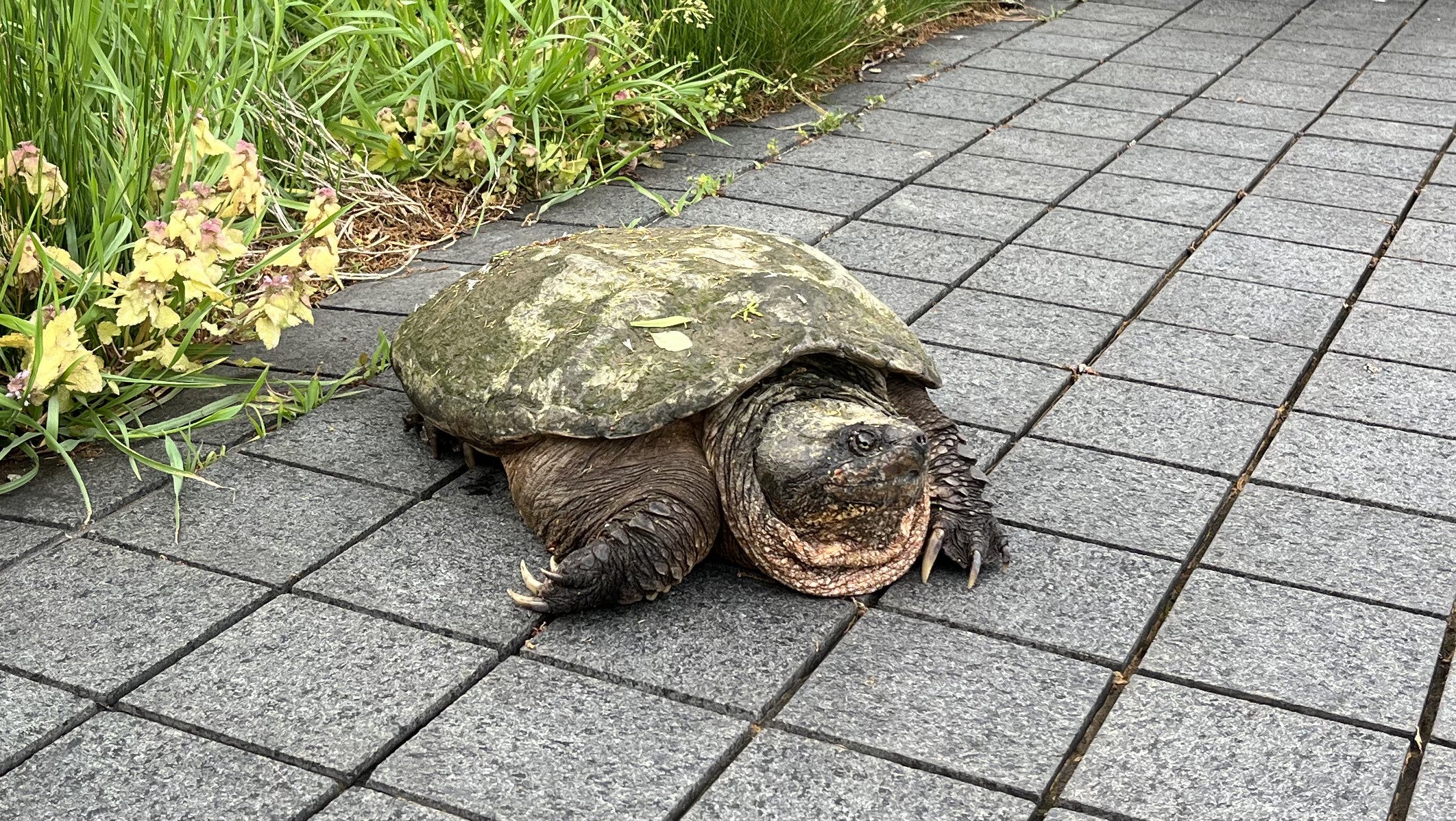 The common snapping turtle is Maryland's largest freshwater turtle weighting on average between 9–35 pounds. These imposing turtles have large heads, keels along the center top of their shells, and long tails with three rows of spiky tubercles. They are commonly found in shallow streams and ponds, although during nesting season—from late April to mid-June—you may even spot them on land as they travel to lay their eggs. Despite their moniker, common snapping turtles are a docile species, spending much of their lives hidden in mud just under the surface of the water, utilizing nostrils set on the tip of their snouts as snorkels.
