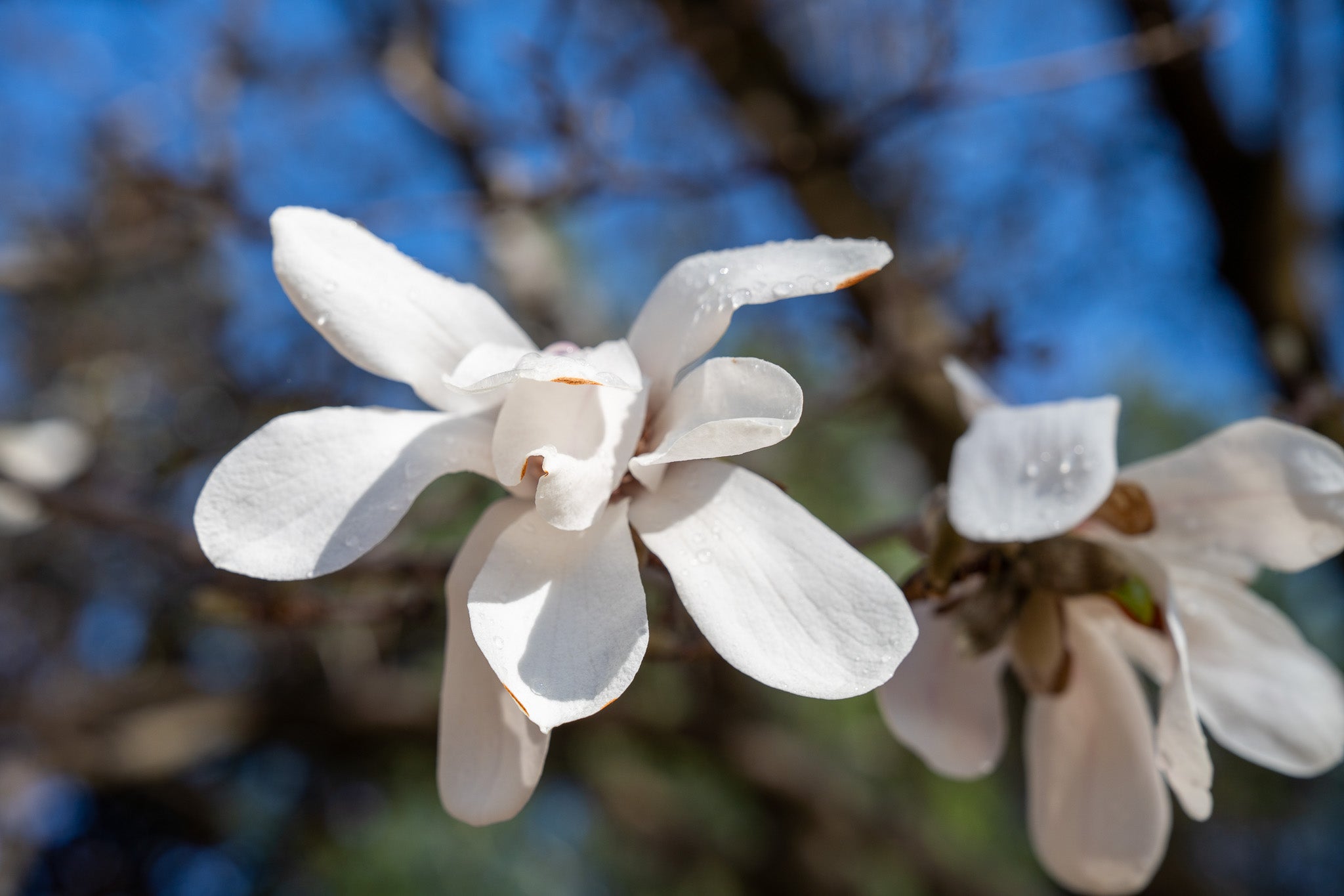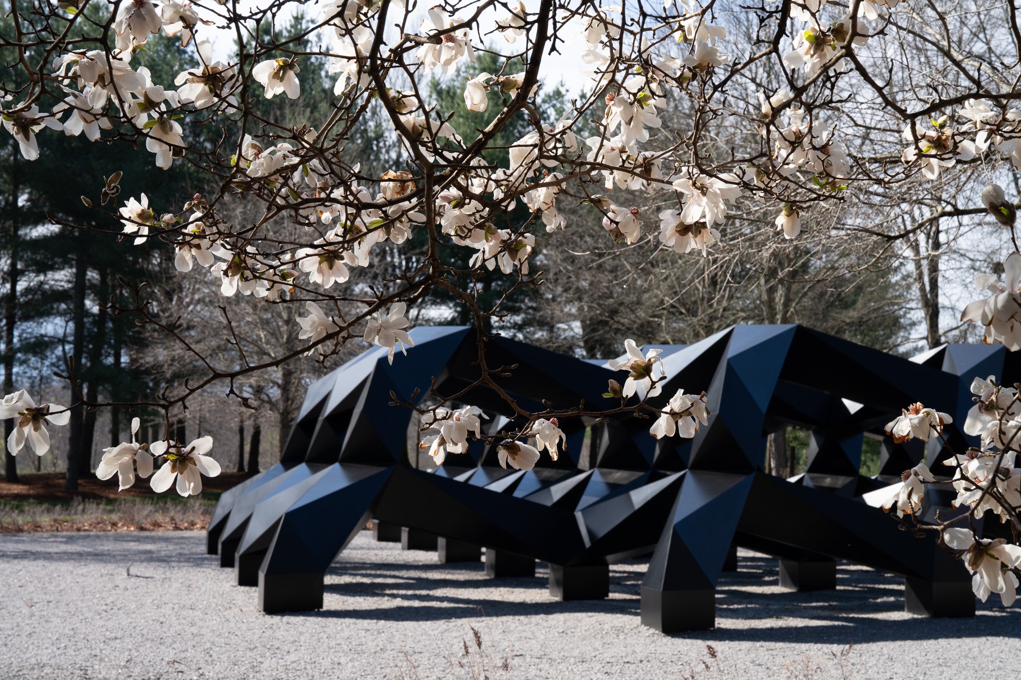 The star magnolia (Magnolia stellata) is a common ornamental shrub (or in this case, small tree) native to Japan. Its placement at Tony Smith's Smug, 1973/2005, predates the current Glenstone emphasis on native flora, though Maryland does have its own native magnolias. (You can find the native southern magnolia, with its waxy green leaves, as well as the sweetbay magnolia, planted nearby. These bloom later in the spring and summer.) The white, fragrant blooms of the star magnolia usually appear in March, just ahead of Washington D.C.'s cherry blossoms, and are a reliable indicator that spring is finally here. Like most magnolias, the new leaves will emerge after the flowers bloom in the spring and persist until the fall.