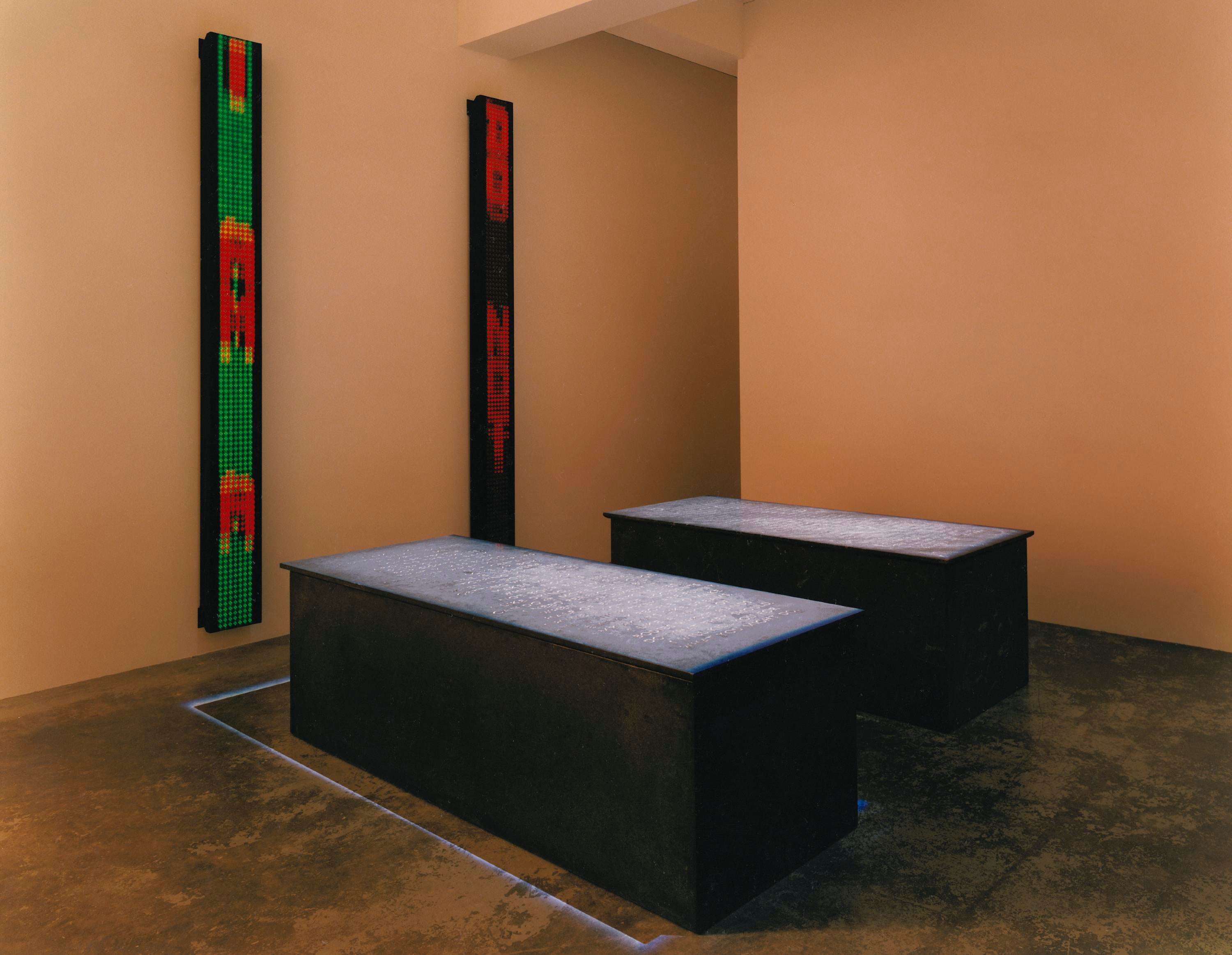 This exhibition includes descriptions of war, violence, and explicit language. Certain installations feature low light levels and animated electronic displays.